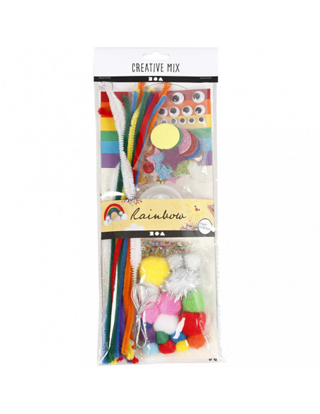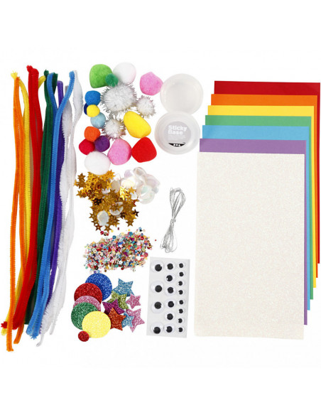 Hobby basismaterialen regenboog Set. De set bestaat uit verschillende basis knutselmaterialen zoals verschillend papier, wiebelogen, glitters, touw, pom-poms, pailletten en nog veel meer!