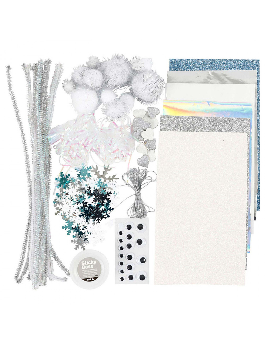 Inhoud: Sticky Base, pailletten, pompons, glitter en metallic papier, iriserend papier, glitter chenilledrad, iriserende cellofaanlametta, zelfklevende wiebelogen, zilverkoord en harten van EVA-schuim met glitter.