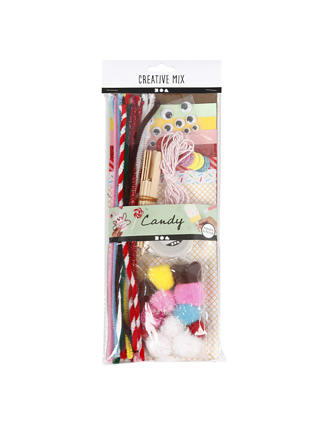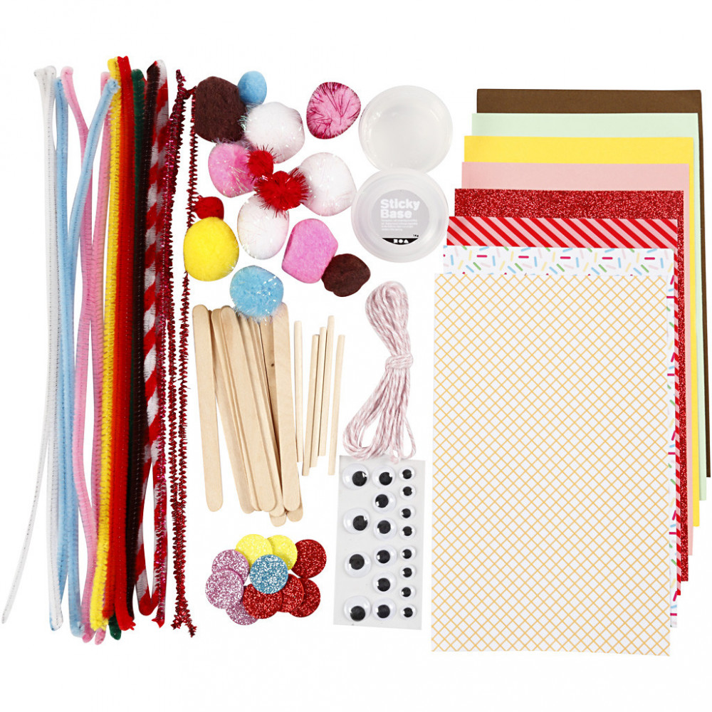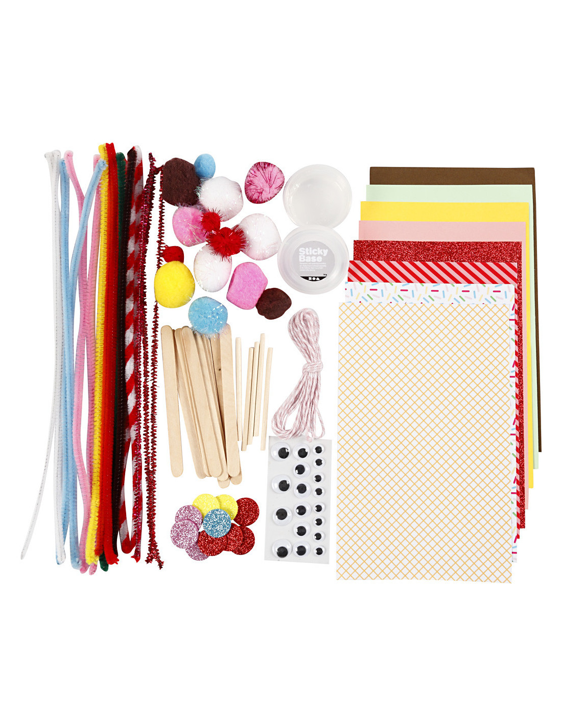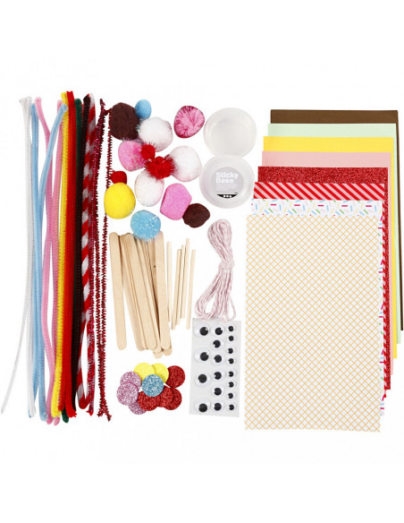 De set bestaat uit verschillende basis knutselmaterialen zoals verschillend papier, wiebelogen, stokjes, touw, pom-poms en nog veel meer!