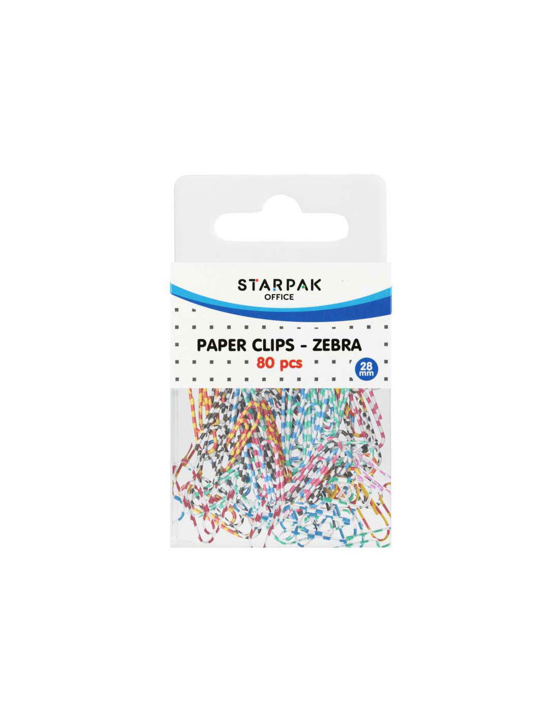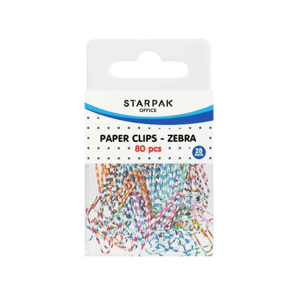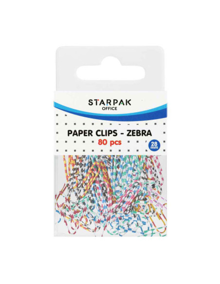 In de verpakking zitten 80 metalen paperclips met gekleurde zebraprint, van 28 mm groot. Niet geschikt voor kinderen onder de 3 jaar.
