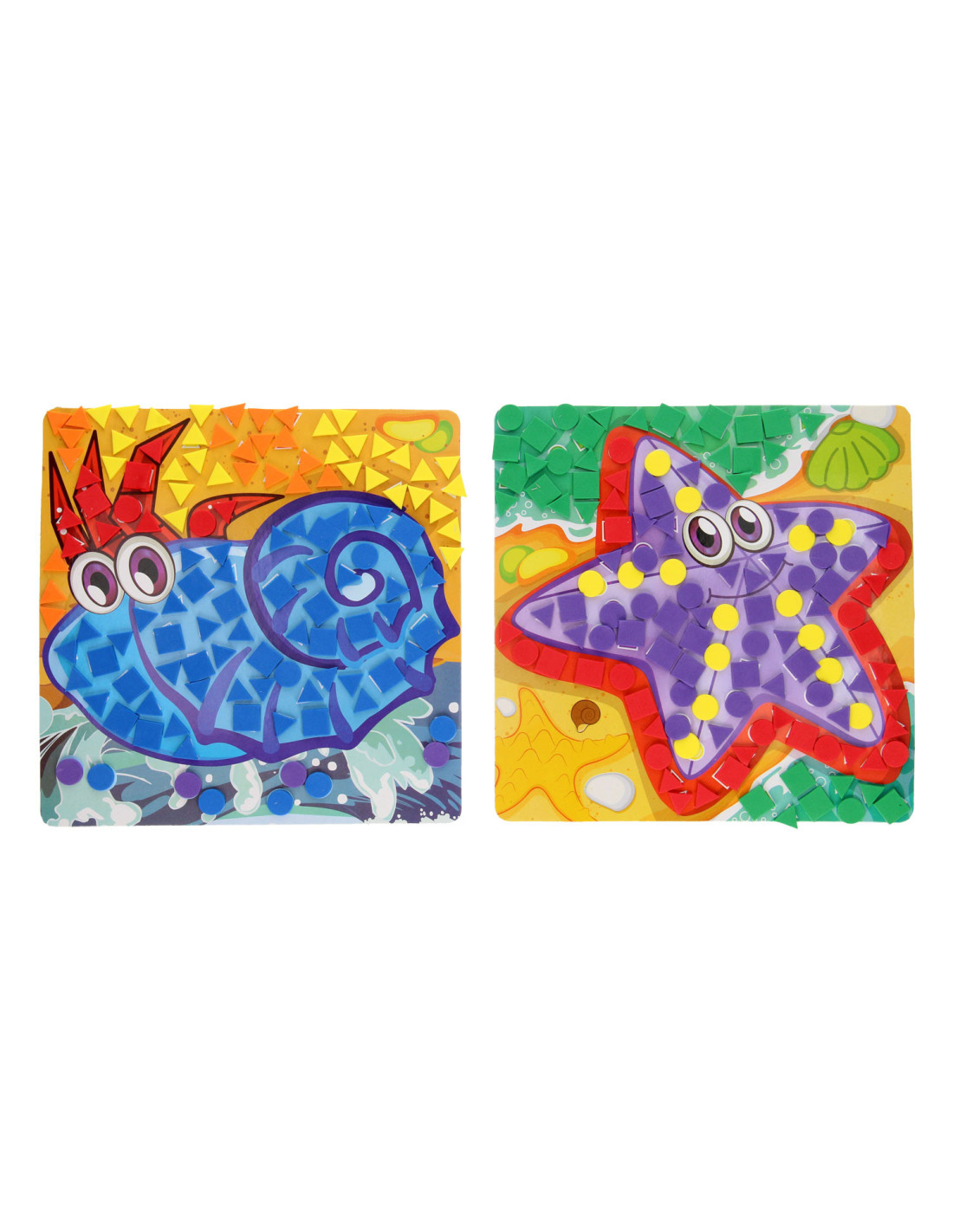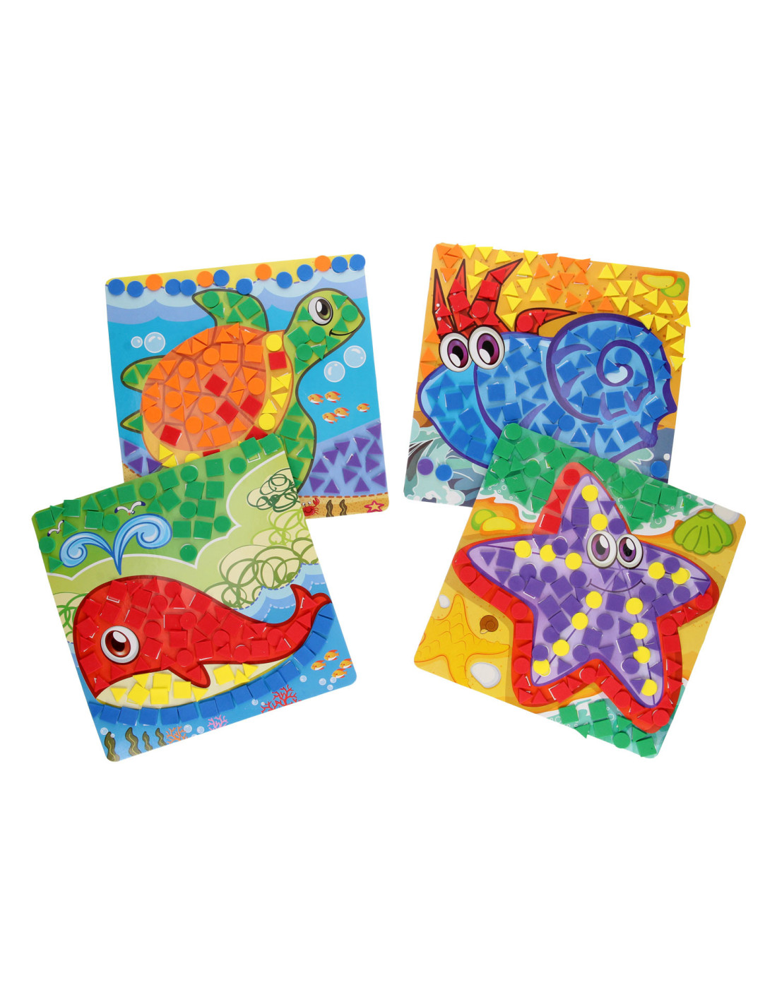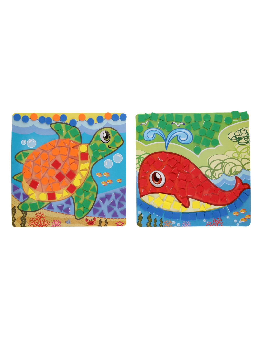 Mozaïek Knutselen Zeedieren is een ideale knutselactiviteit voor kleintjes vanaf 3 jaar. De mozaïekstukjes zijn groot, zodat kleine kinderhandjes ze goed kunnen vastpakken. De set bestaat uit 4 grappige kartonnen platen met zeedieren, 4 hangertjes om ze mee op te hangen en meer dan 700 foamstickers in 6 verschillende kleuren.