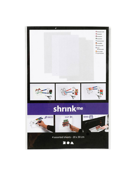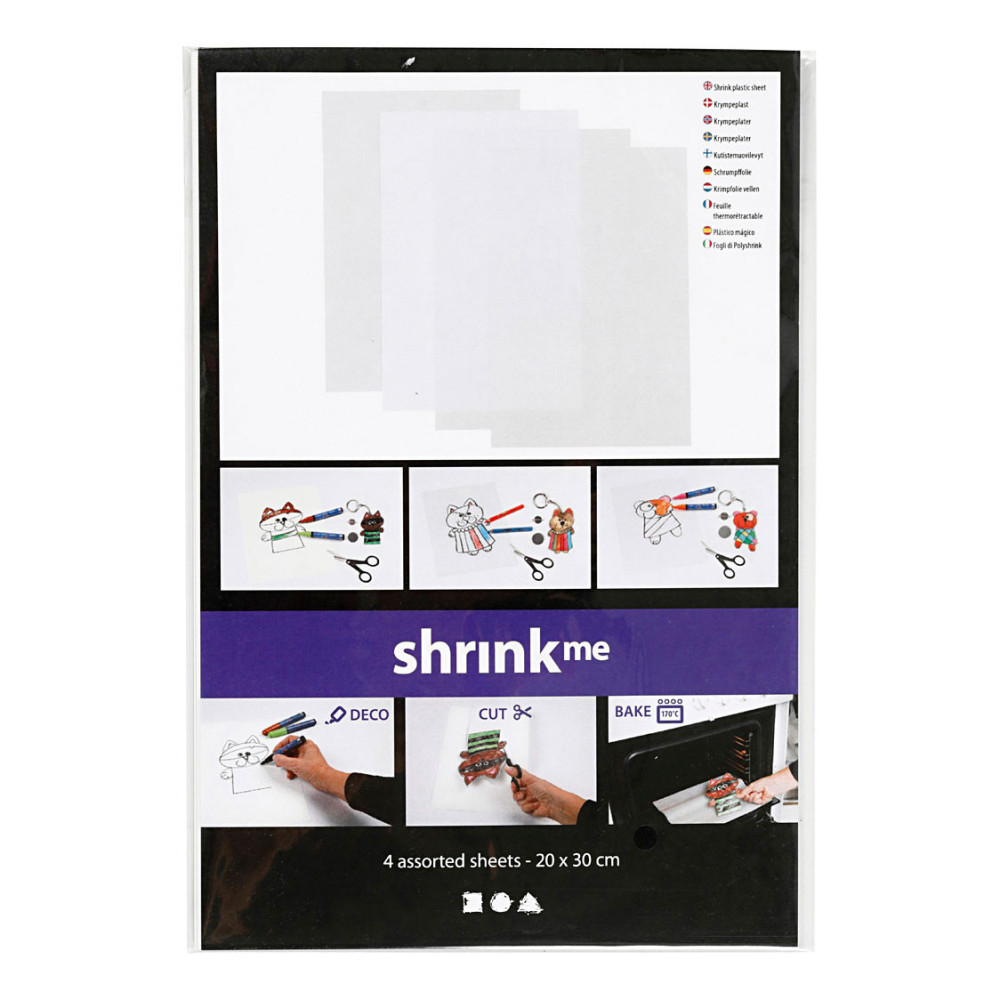 Vellen krimpfolie met een glanzend oppervlak aan één zijde en mat aan de andere om te decoreren en figuren te maken. Soort: Transparant Glans, 20x30 centimeter groot. Inhoud: 4 stuks.