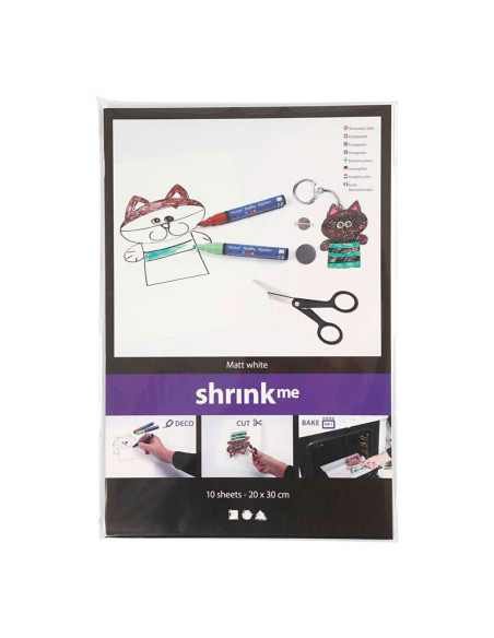 Vellen krimpfolie met een glanzend oppervlak aan één zijde en mat aan de andere om te decoreren en figuren te maken. Soort: Mat Wit, 20x30 centimeter groot. Inhoud: 10 stuks.