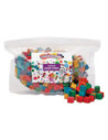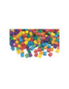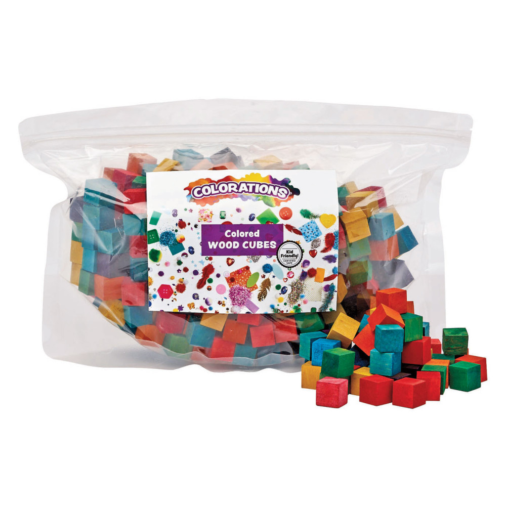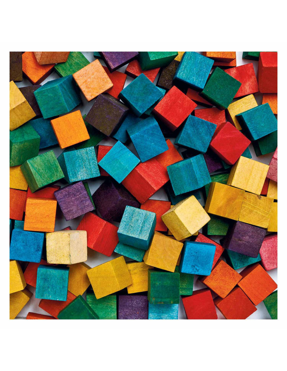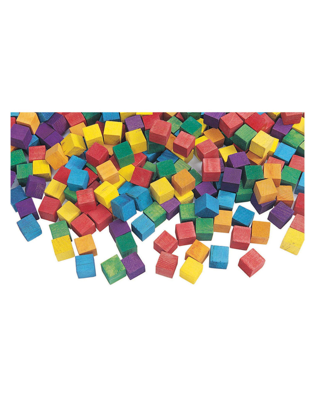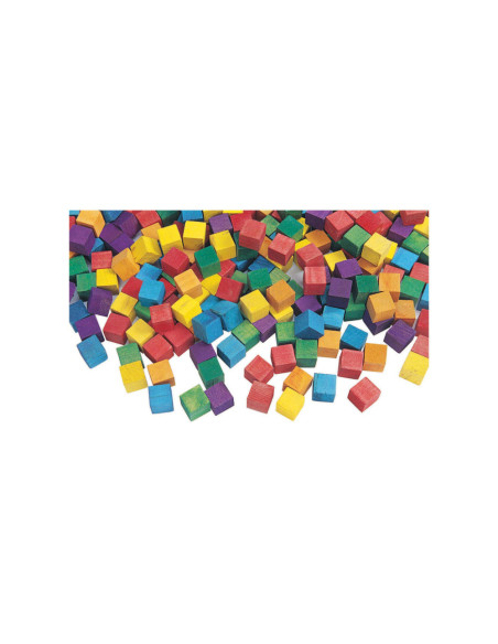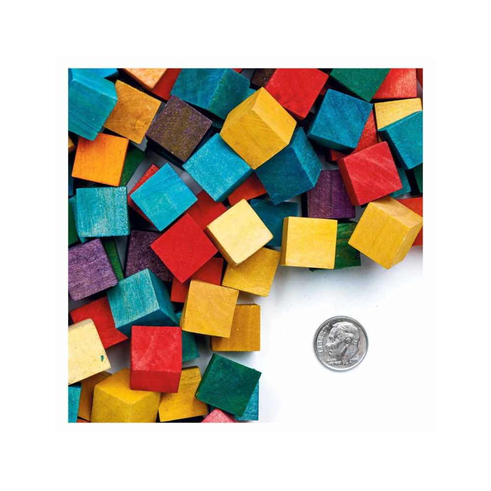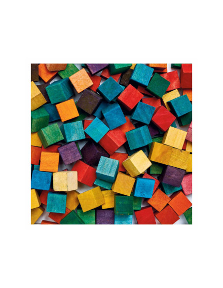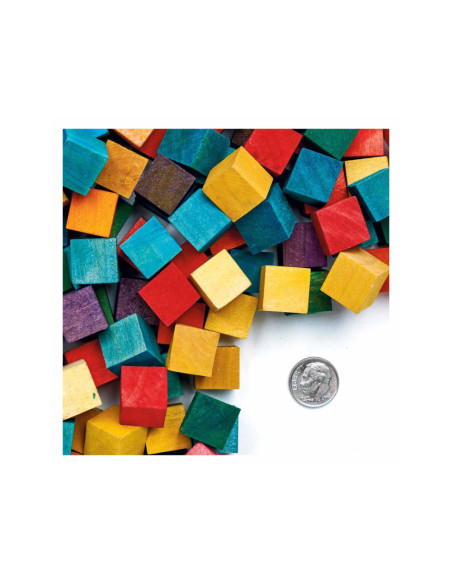 Set met 196 houten blokjes van 1,5 cm groot in levendige kleuren (groen, geel, blauw, rood, oranje). Verpakt in opstaande, hersluitbare zak voor eenvoudig opbergen. Geschikt om mee te knutselen.