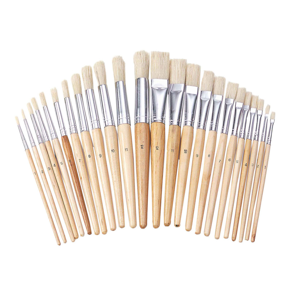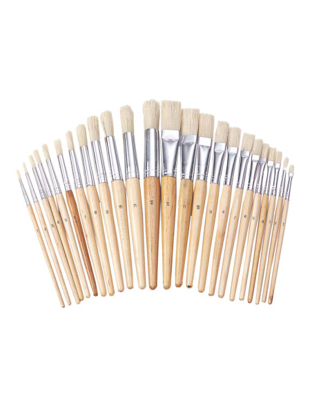 Set van 24 houten kwasten/penselen in verschillende groottes en diktes. De stelen zijn van hout en de haren van natuurlijk haar. Variërend van 15 cm - 20,5 cm lang.