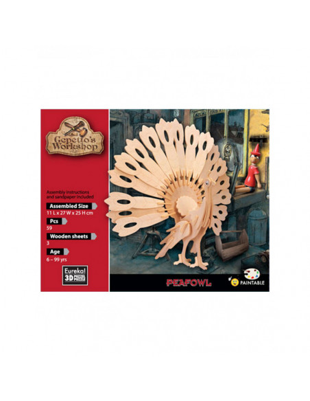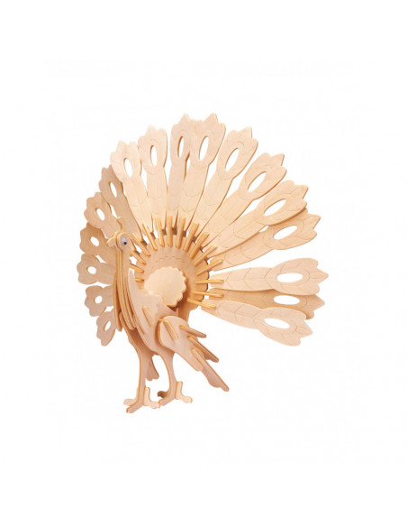 Bouwpakket van houten pauw met 59 onderdelen, formaat 11 x 27 x 25 cm, inclusief instructie.