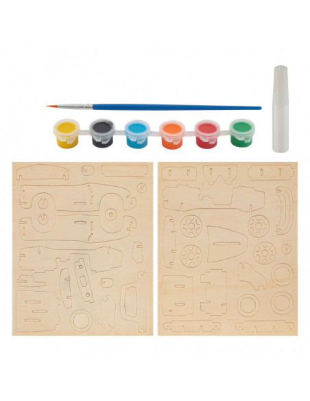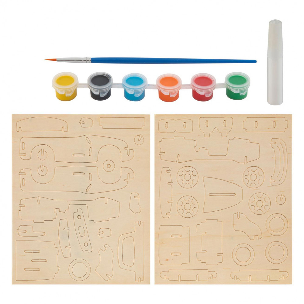 Bouw- en schilderpakket voor het maken van je eigen houten auto. Zet de onderdelen in elkaar en beschilder hem naar eigen wens. Dit bouwpakket bevat 6 verfpotjes en een kwastje. Gemaakt van hout en geschikt vanaf 5 jaar.