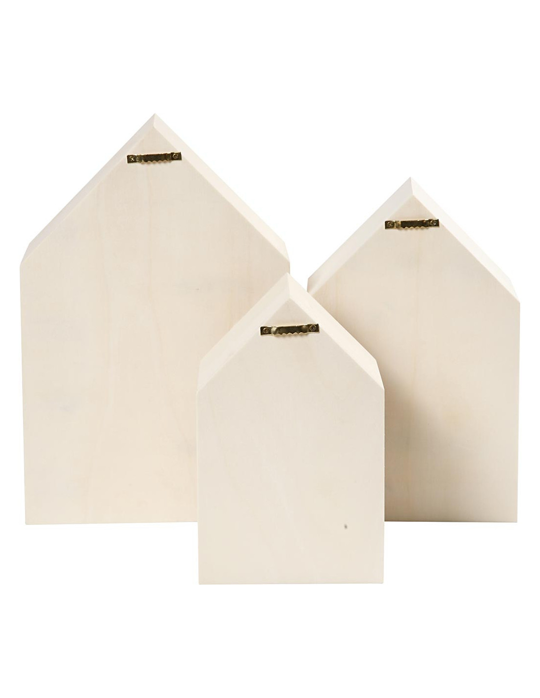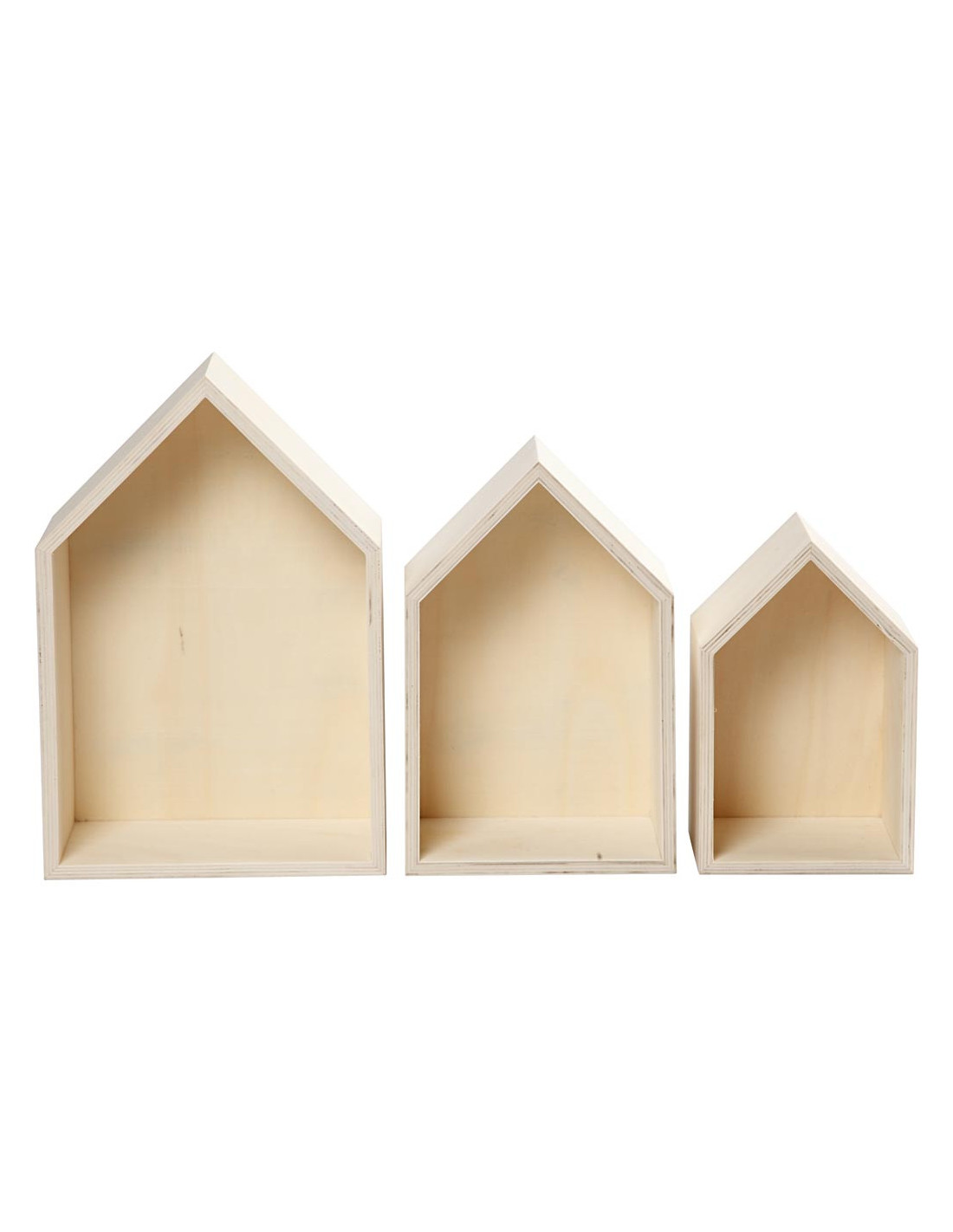 Showdozen met ophangsysteem in vorm van huisjes. Perfect voor opbergen of als display. Deze dozen zijn voorzien van ophangbeslag aan de achterkant, zodat je ze makkelijk op kunt hangen. Gebruik ze voor je knutselspullen, sieraden of zelfs als een decoratie item in je huis. Deze houten dozen zijn een must-have voor iedereen die op zoek is naar een stijlvolle en functionele oplossing voor opslag.