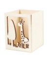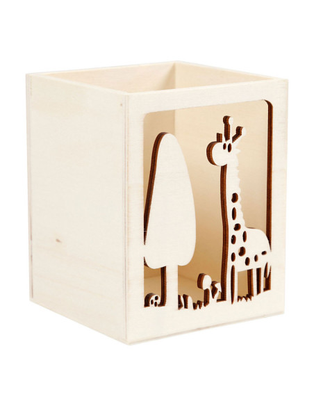 Vierkant pennenbakje van licht hout met uitgesneden motief aan een kant. Ideaal als pennenbakje of als lantaarn met LED lampje.Het pennenbakje is eenvoudig te decoreren met Plus Color acrylverf, houtbranden, stempels enzovoort.