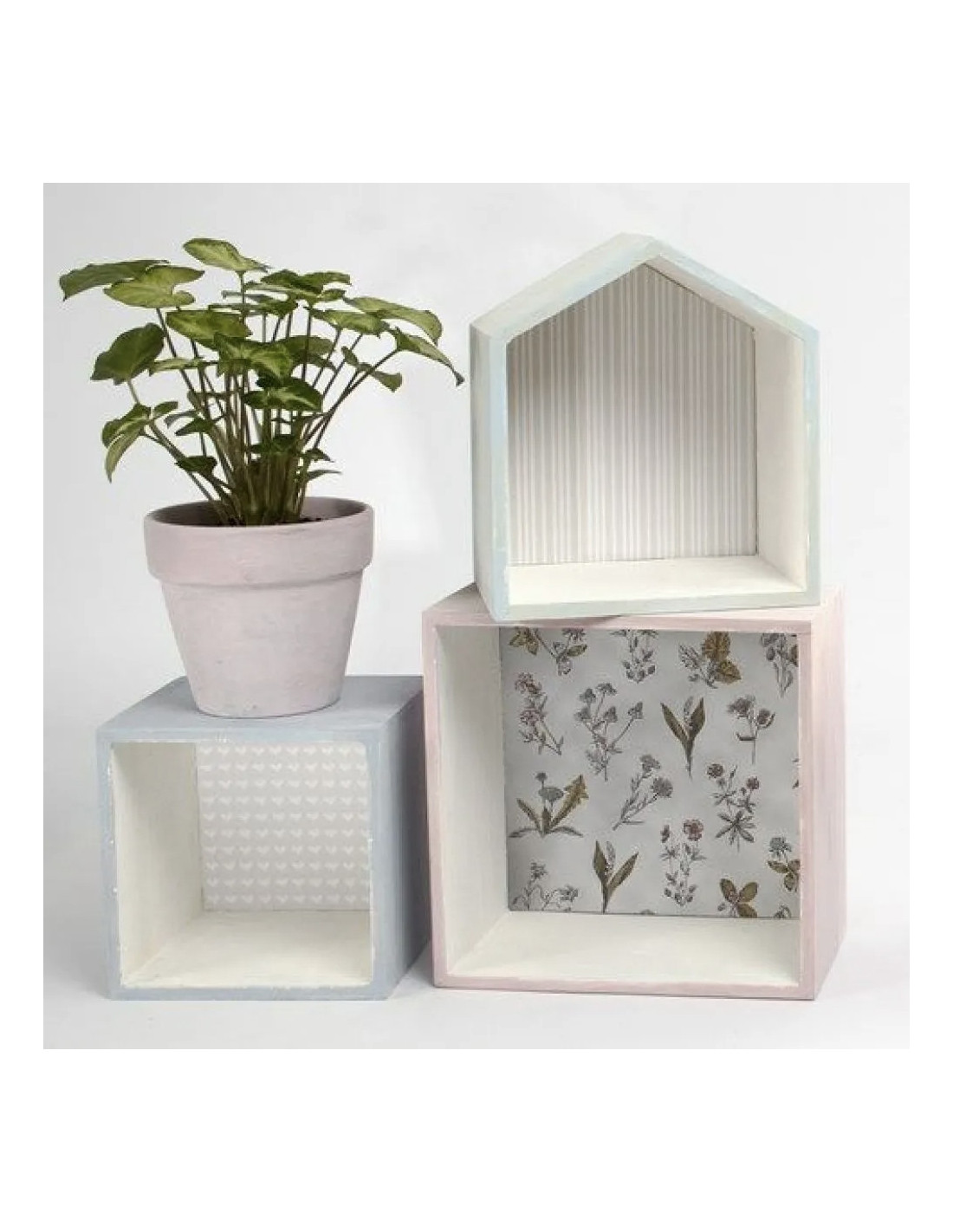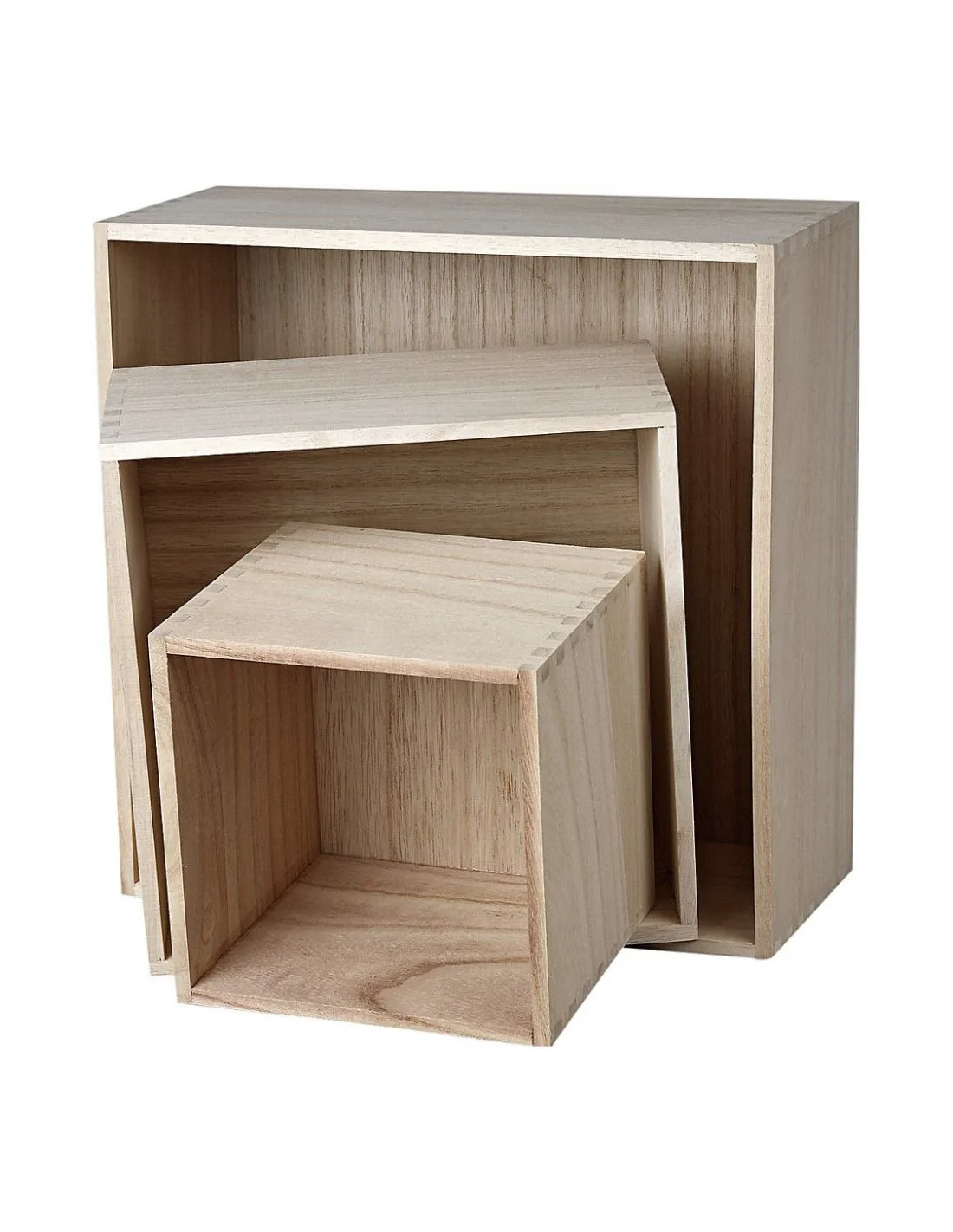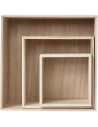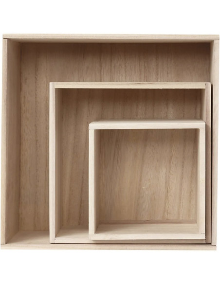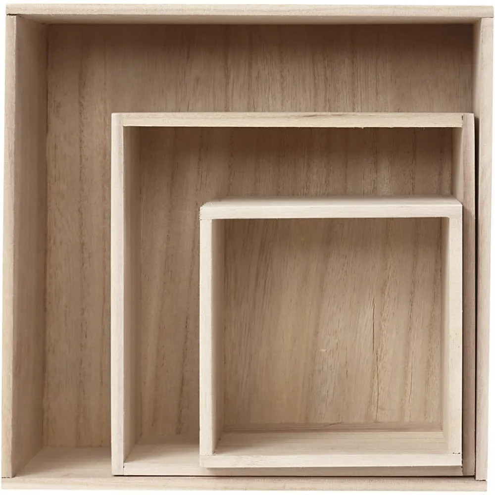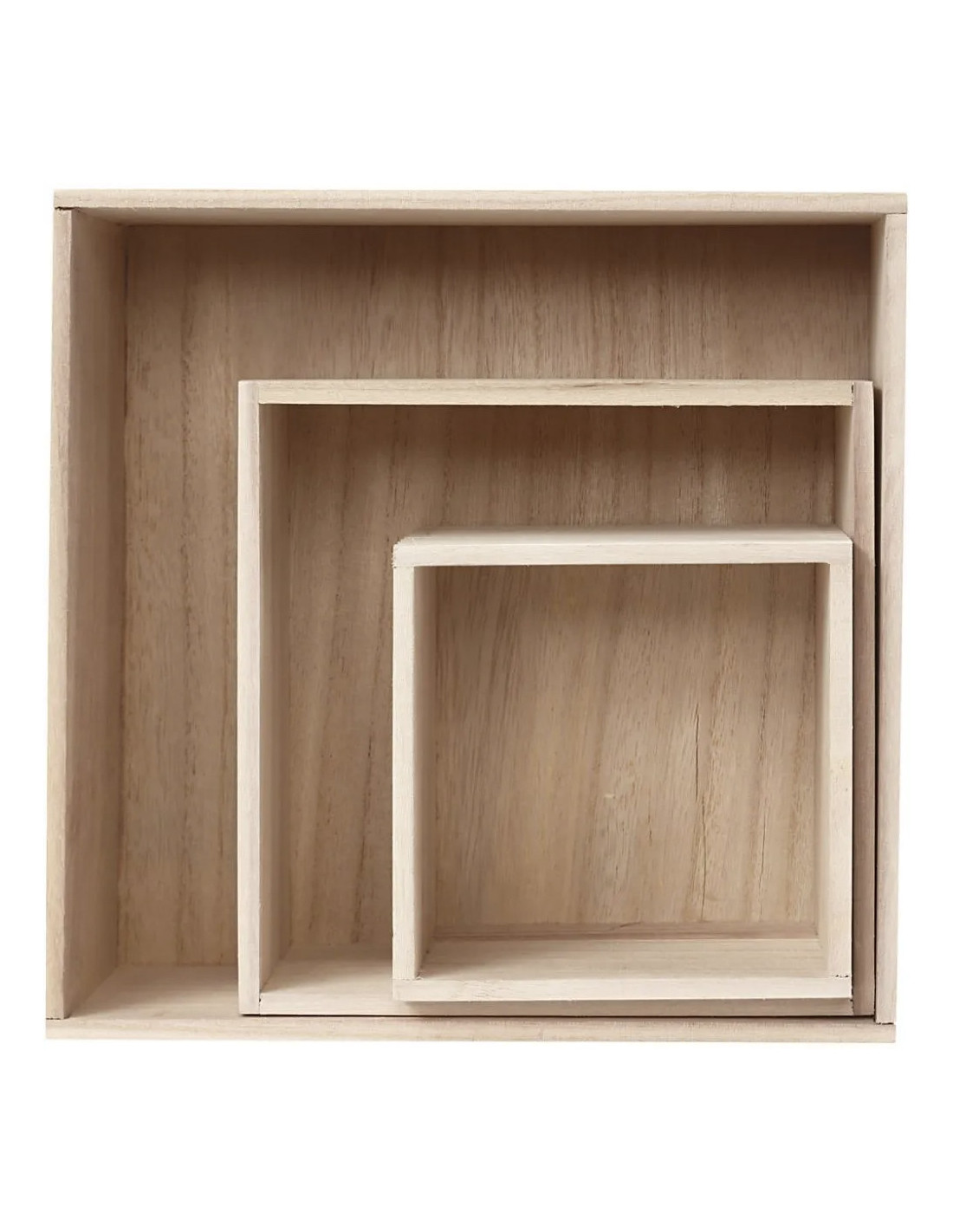 Set van drie houten vierkante dozen. Deze set bevat 3 maten dozen: 15x15+21,5x21,5+28x28 cm. De hoogte van de dozen is 12,5 centimeter. Deze houten dozen zijn perfect voor opbergen of als display. Je kunt ze gebruiken voor je knutselspullen, sieraden of zelfs als een decoratie item in je huis. De vierkante vorm is uniek en geeft een leuke touch aan deze set. Dus als je op zoek bent naar een stijlvolle en functionele oplossing voor opslag, dan is deze set houten dozen een must-have.