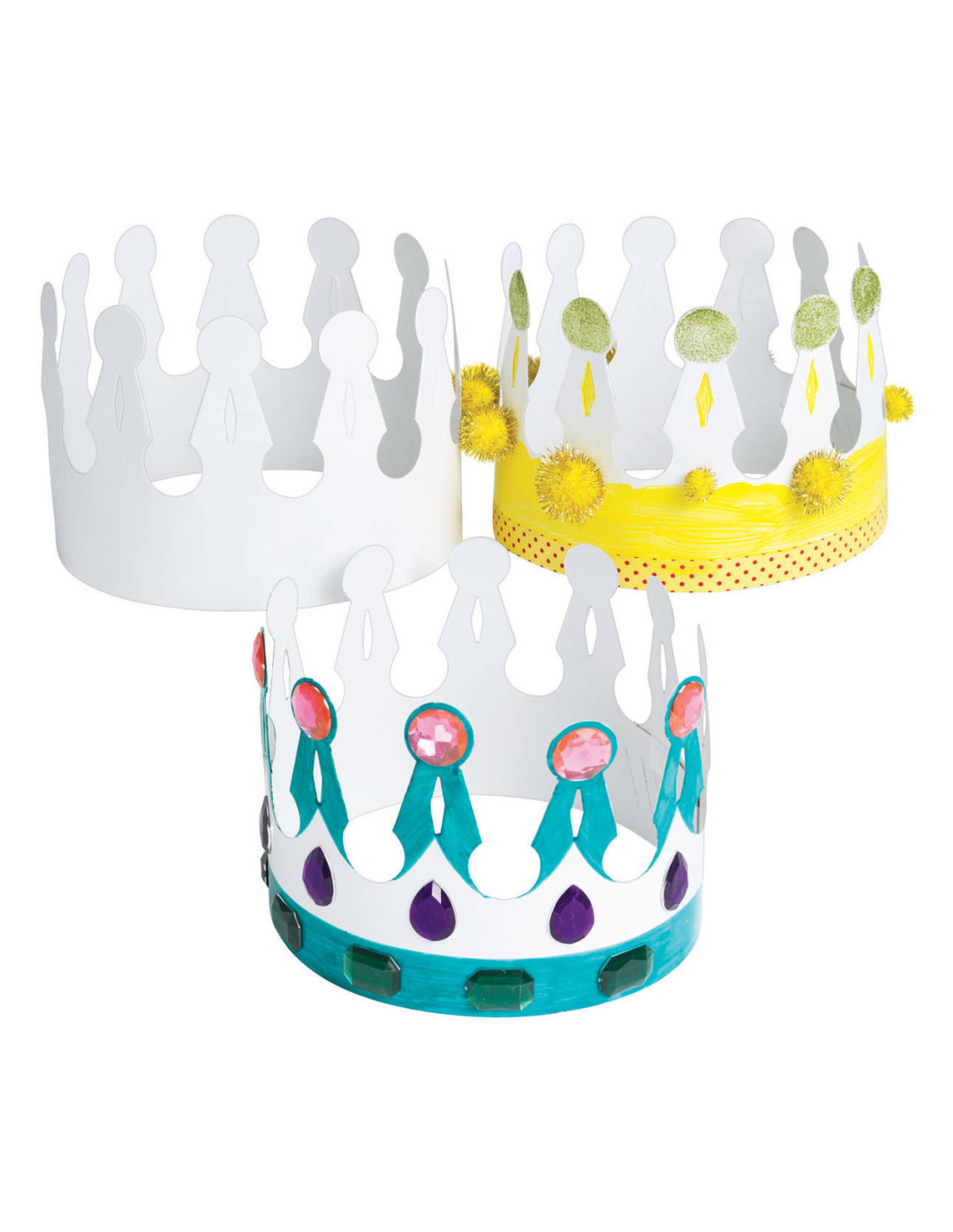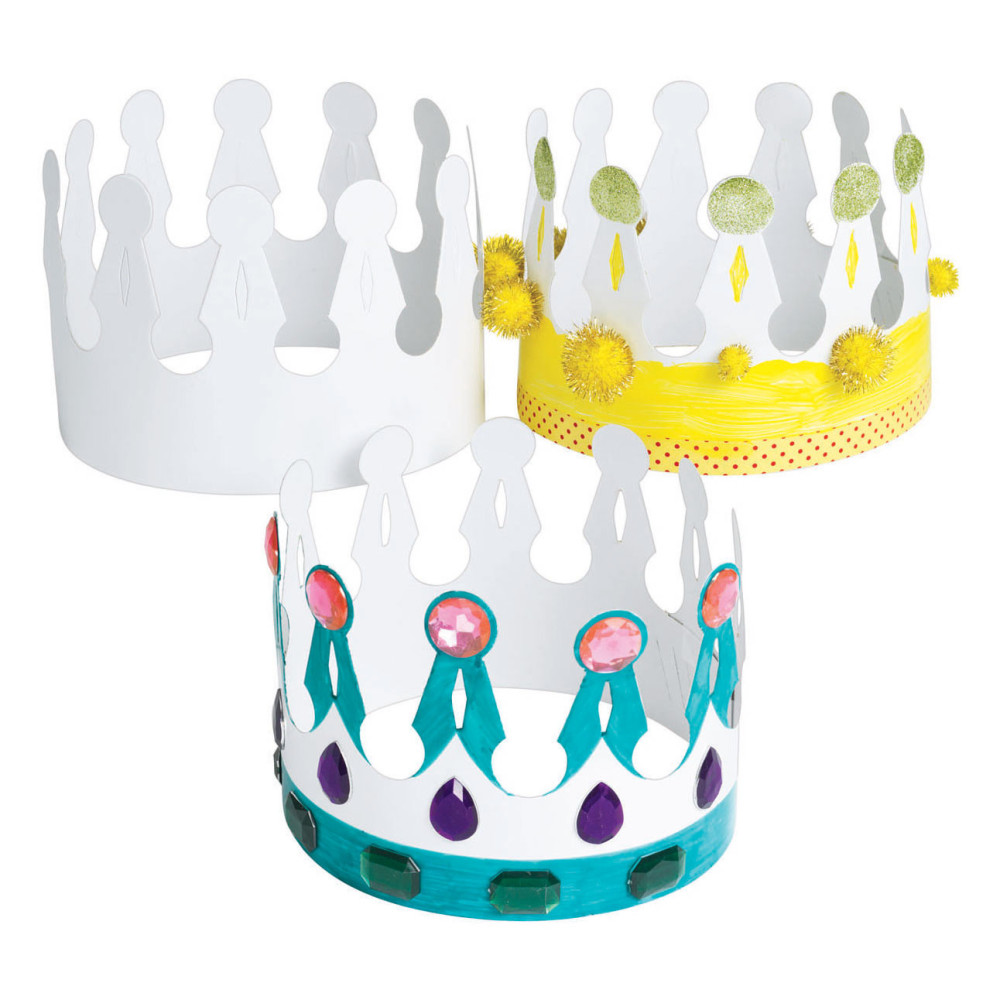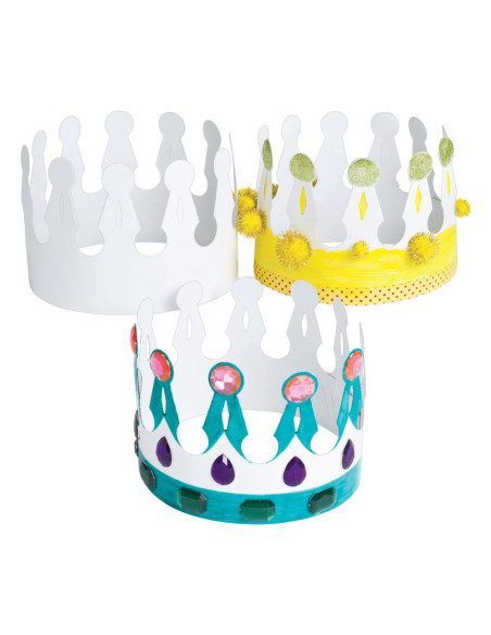 • VERSTELBAAR: Deze kronen zijn gemaakt van wit karton en kunnen worden aangepast aan het hoofd van elk kind.