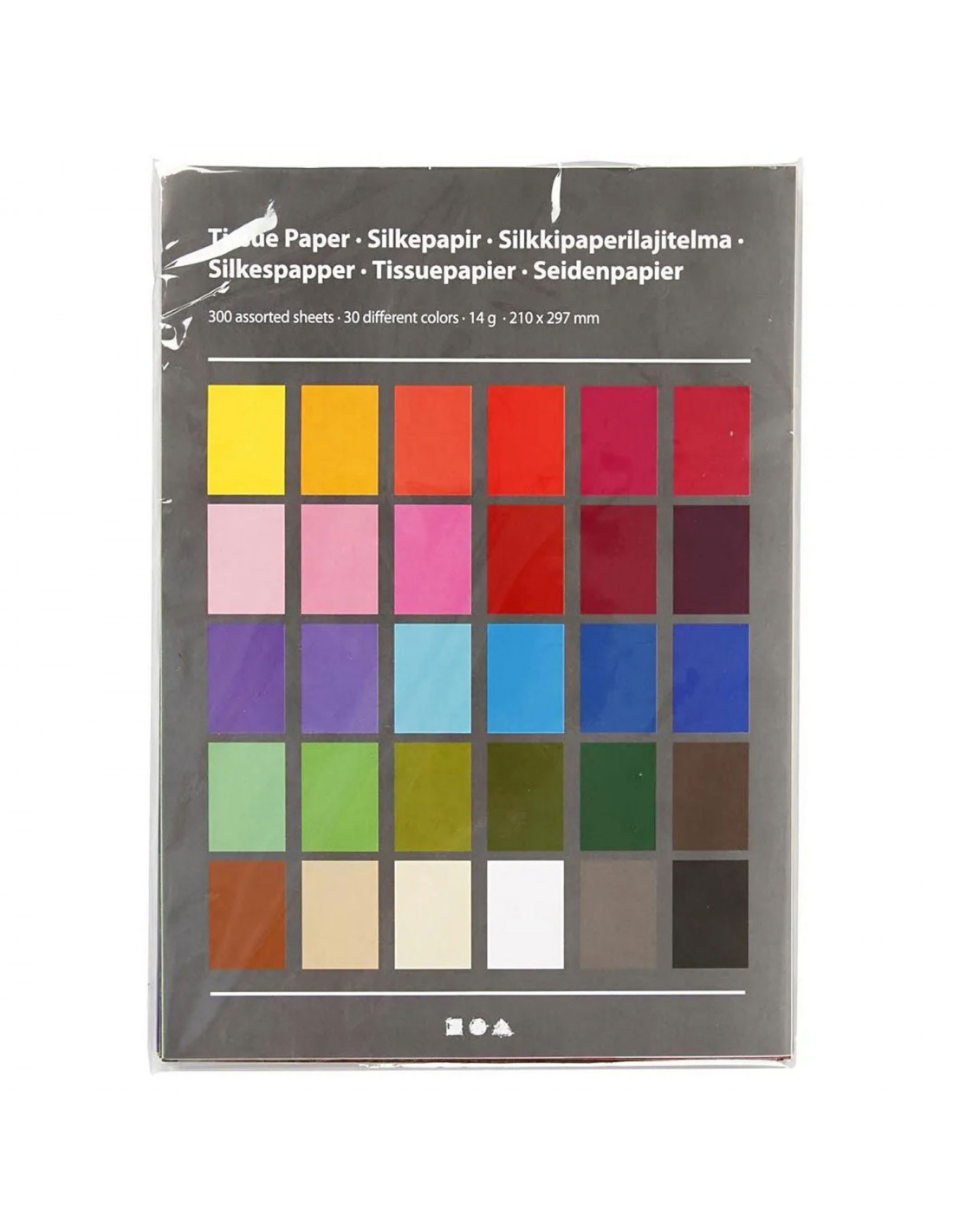 Tissuepapier A4 Gekleurd, 300st. In de verpakking zitten 300 vellen gekleurd vliegerpapier waarvan iedere kleur 10 keer. Afmeting: 21,0 x 29,7 centimeter.