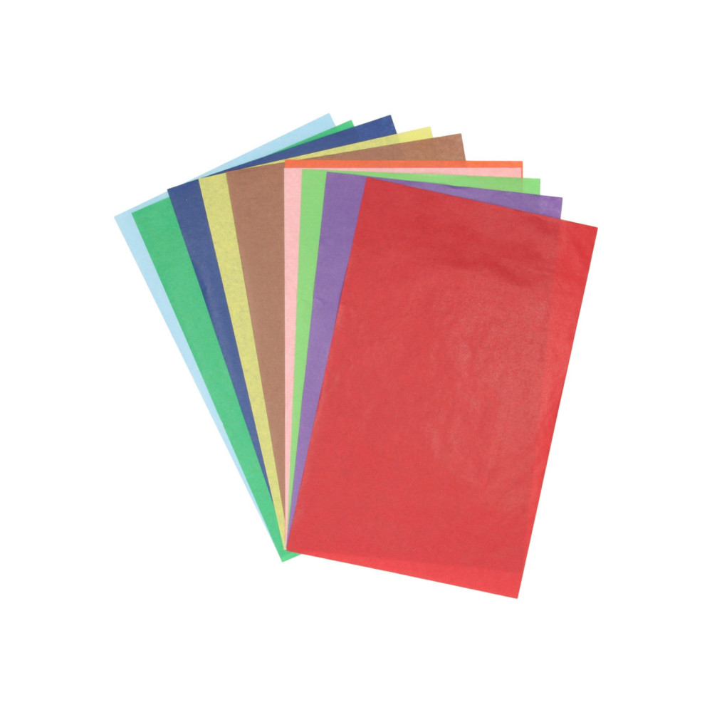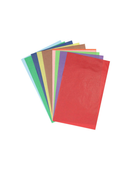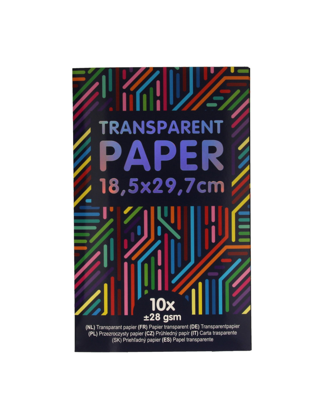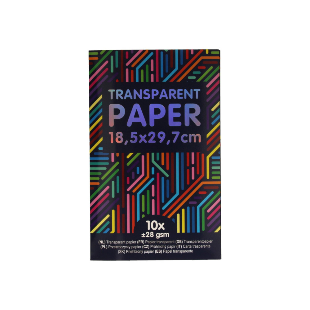 Set van 10 vellen transparant papier (28 grams) in verschillende kleuren. Afmetingen: 18,5 x 29,7 centimeter. Geschikt voor het knutselen van bijvoorbeeld lantaarns en kijkdozen.