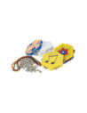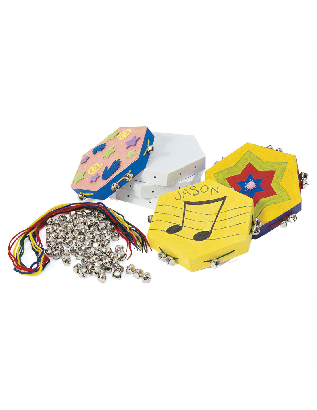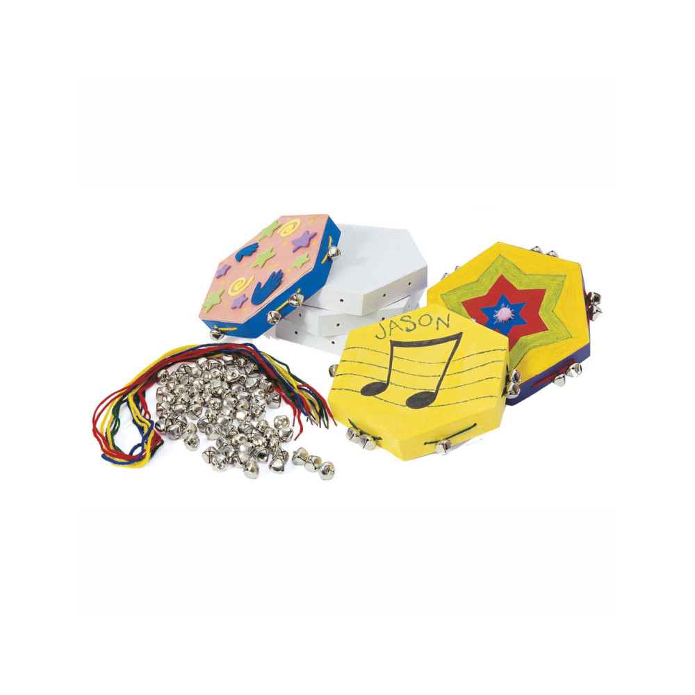 We hebben ritme, we hebben kunst! Deze exclusieve, superduurzame tamboerijnen zijn leuk om te versieren en nog leuker om mee te spelen! Gebruik verf, stift, krijt, potlood en andere knutselmaterialen om een uniek instrument te maken. Daarna gewoon rijgen, strikken en spelen! De knutselset bevat grote, duurzame papier-maché tamboerijnen, bellen, snaren en een handleiding.