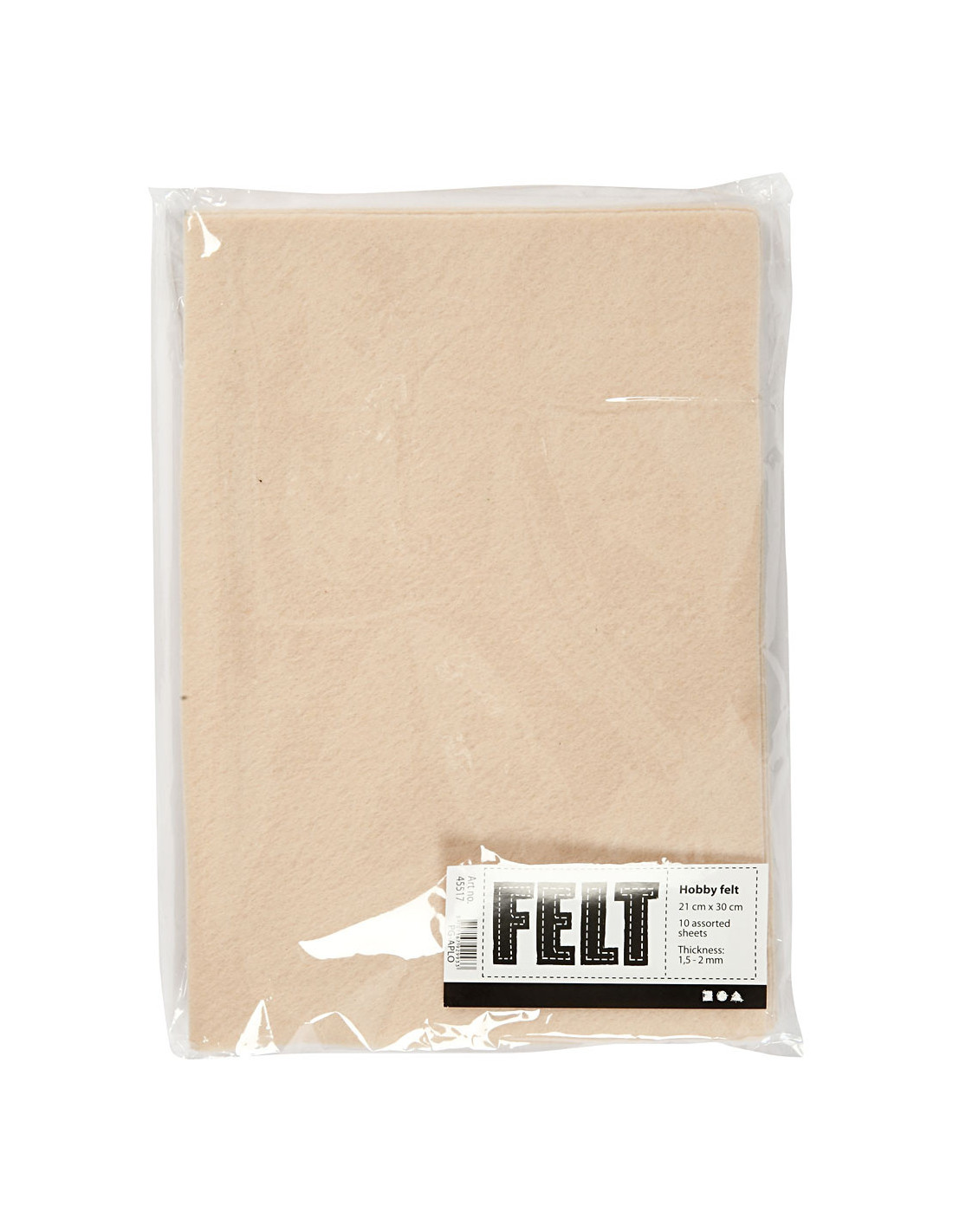 Pak met A4-formaat hobbyvilt in de kleur licht beige. Ideaal om mee te knutselen! De set bestaat uit 10 vellen. Dikte: 1,5 - 2 mm.