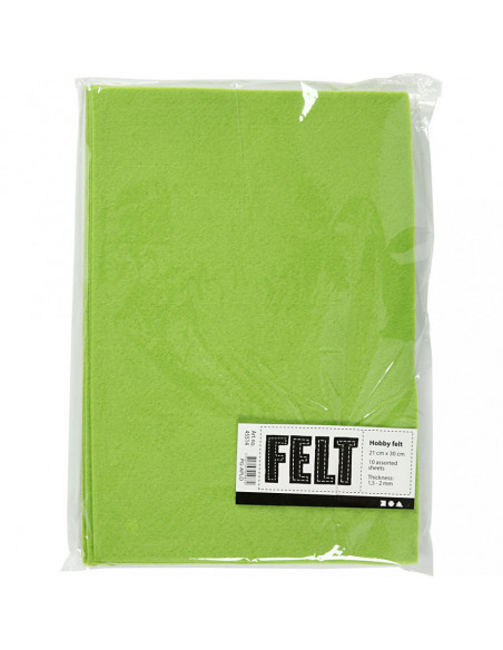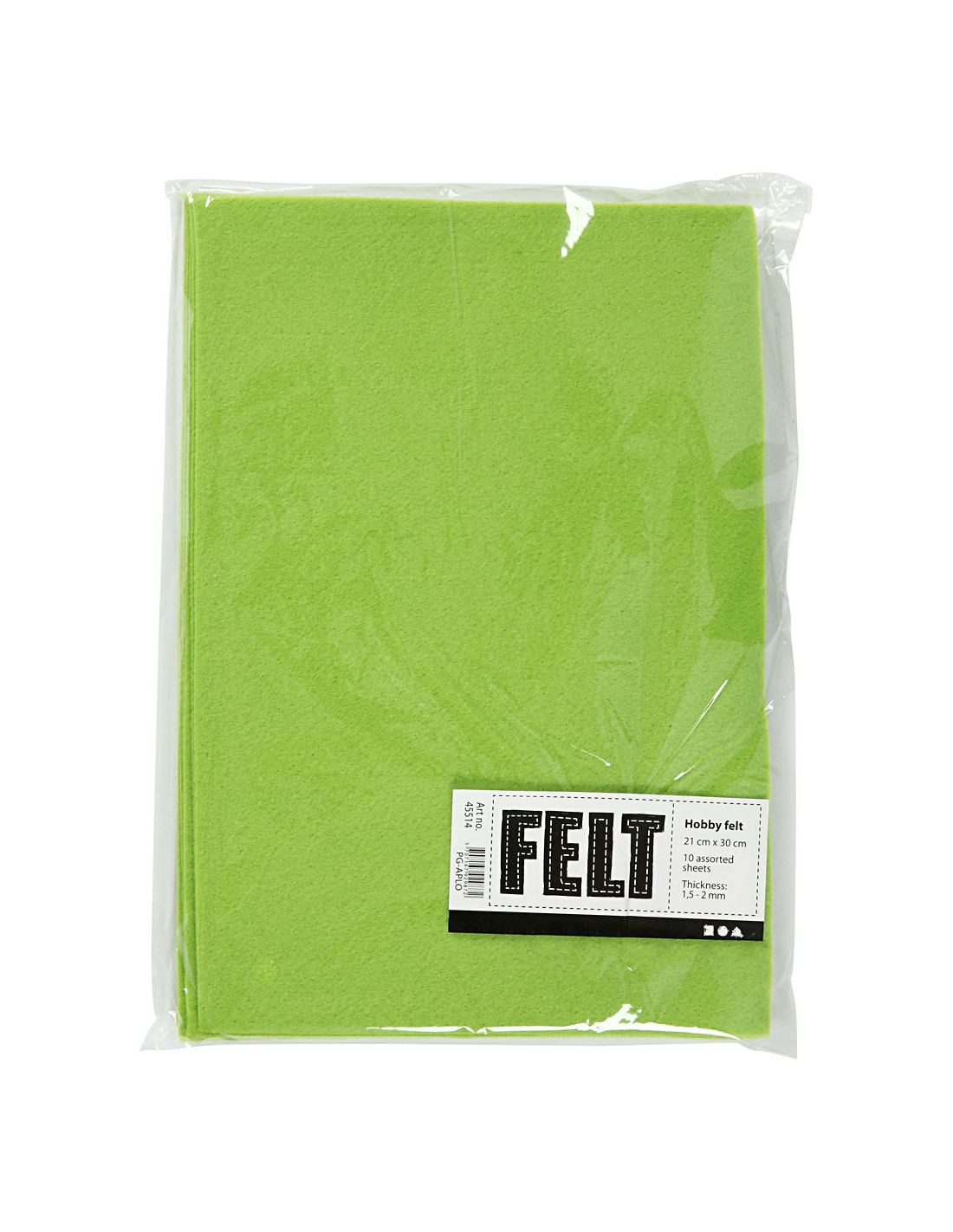 Pak met A4-formaat hobbyvilt in de kleur lichtgroen. Ideaal om mee te knutselen! De set bestaat uit 10 vellen. Dikte: 1,5 - 2 mm.
