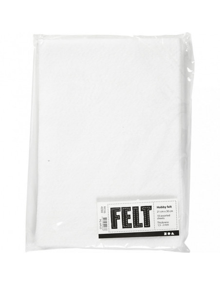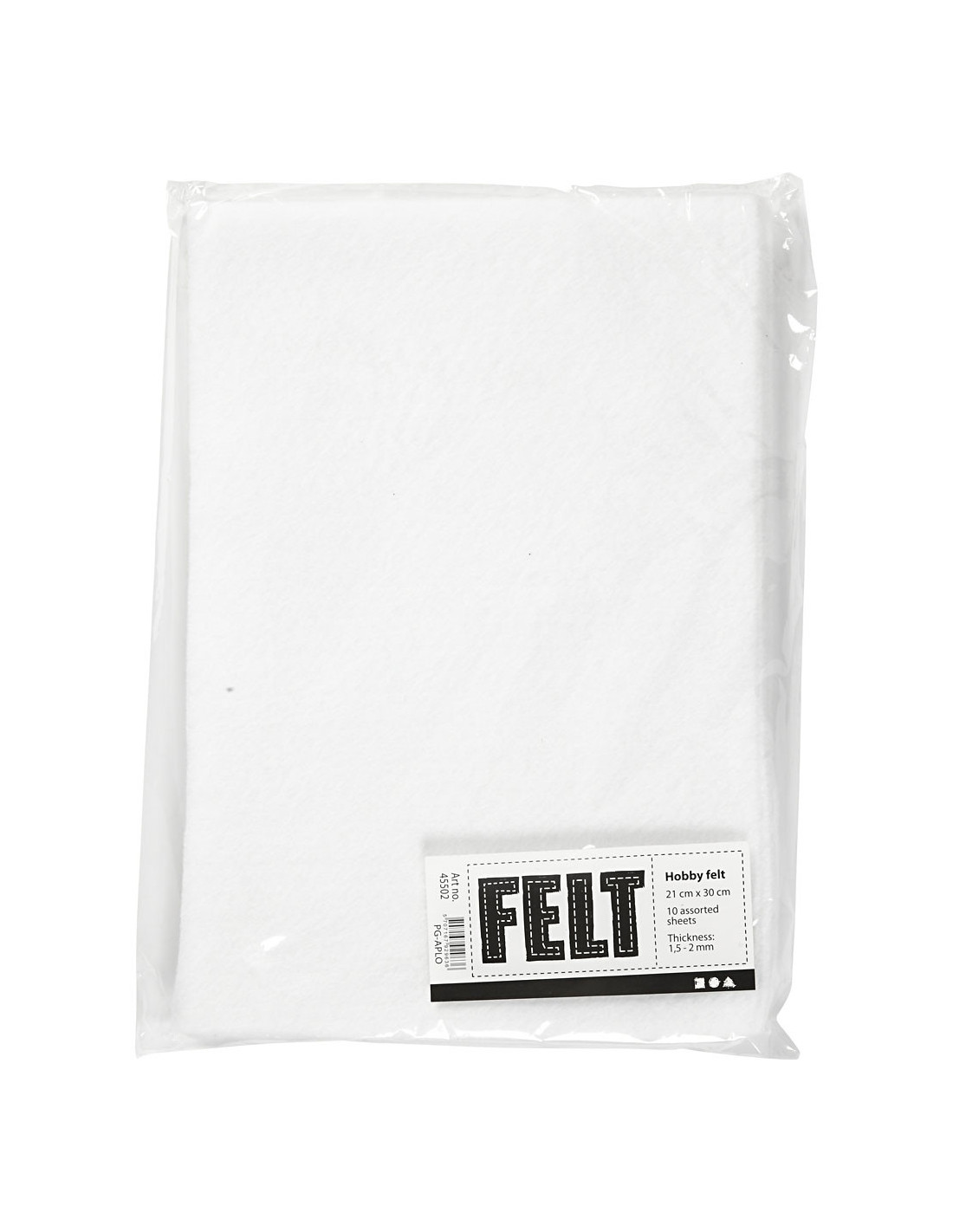 Pak met A4-formaat hobbyvilt in de kleur wit. Ideaal om mee te knutselen! De set bestaat uit 10 vellen. Dikte: 1,5 - 2 mm.