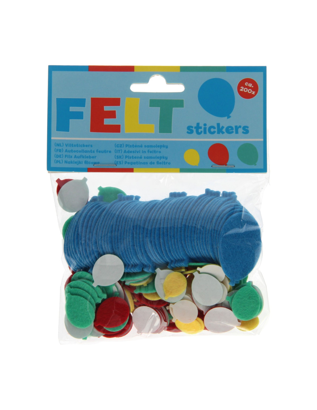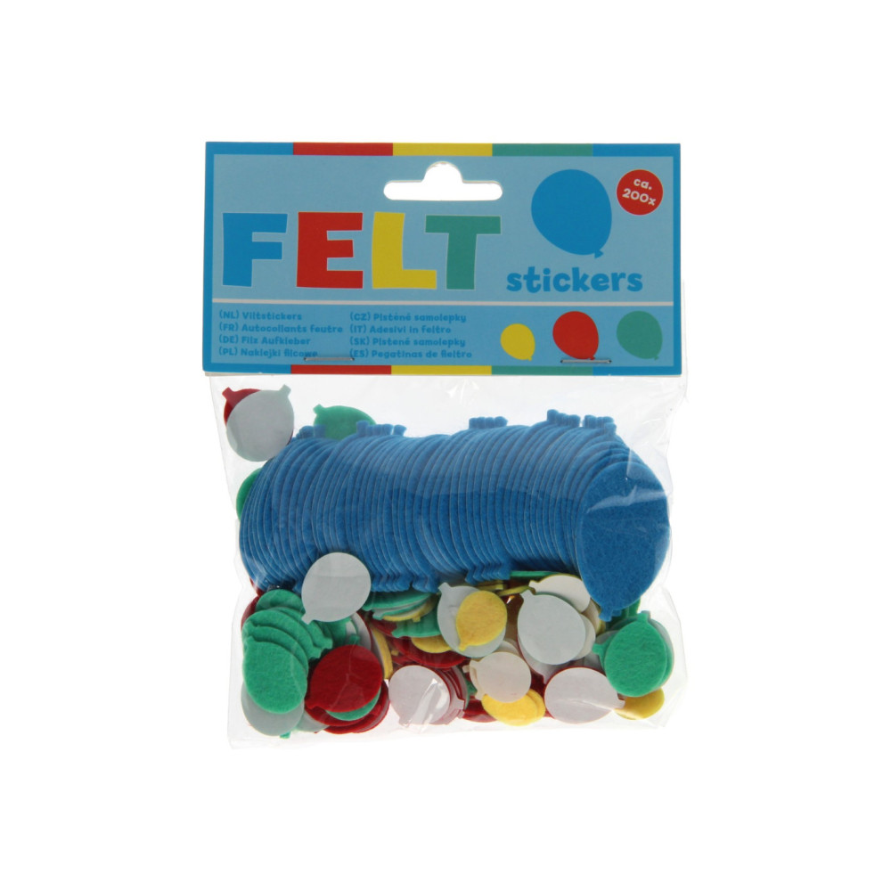 Zakje met 200 viltstickers in de vorm van ballonnen in verschillende maten en kleuren. Niet geschikt voor kinderen jonger dan 3 jaar.