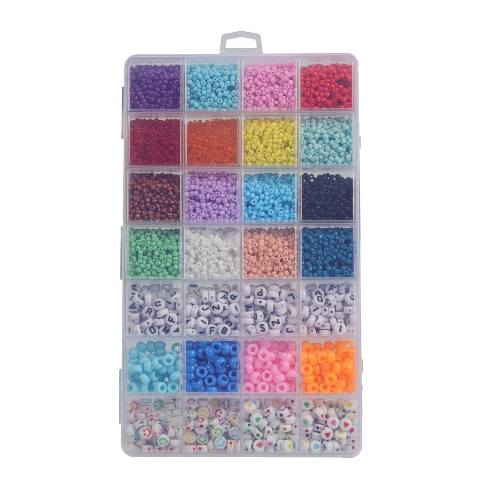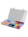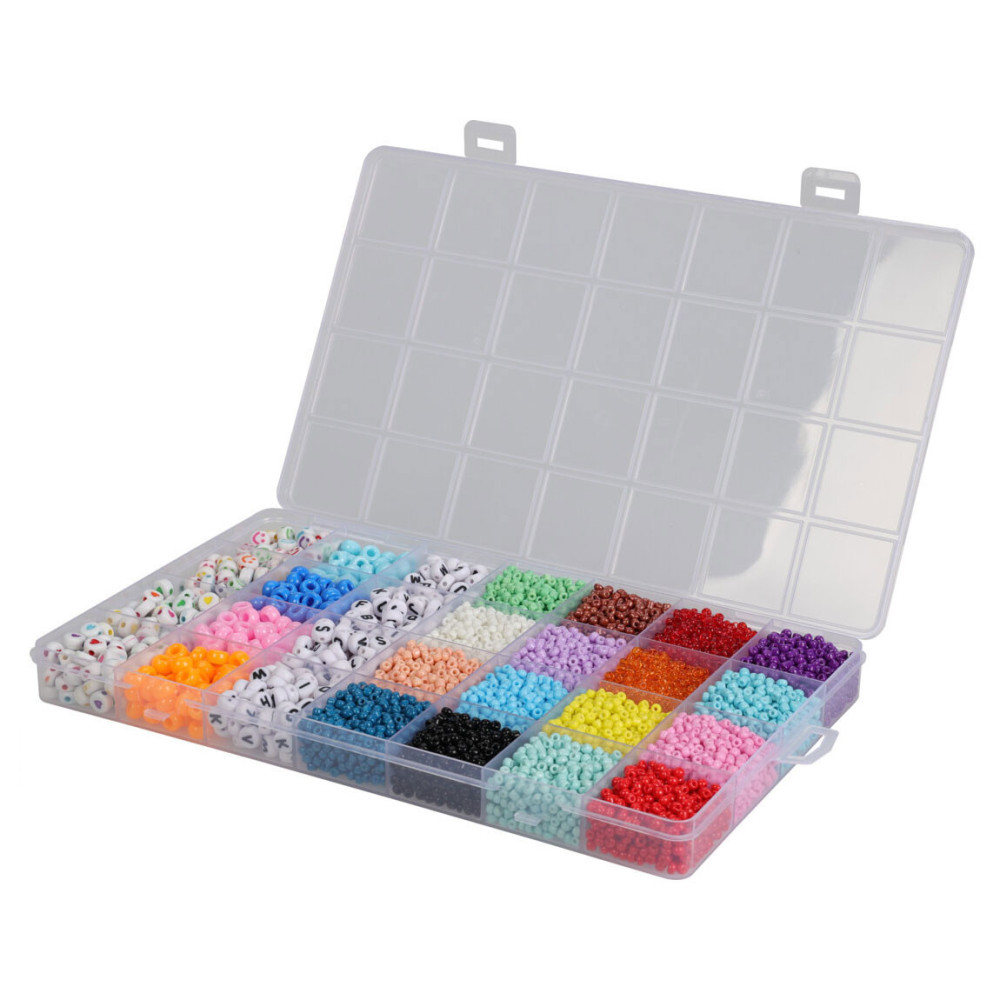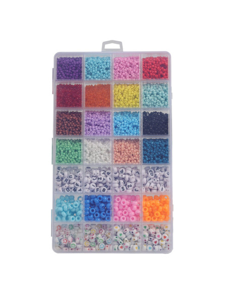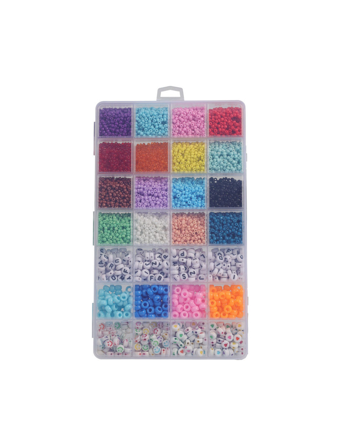 Kunststof opbergdoos met 28 verschillende soorten kraaltjes (440 gram). O.a. letterkralen, smileykralen en gekleurde kralen in verschillende formaten. Niet geschikt voor kinderen jonger dan 3 jaar oud.