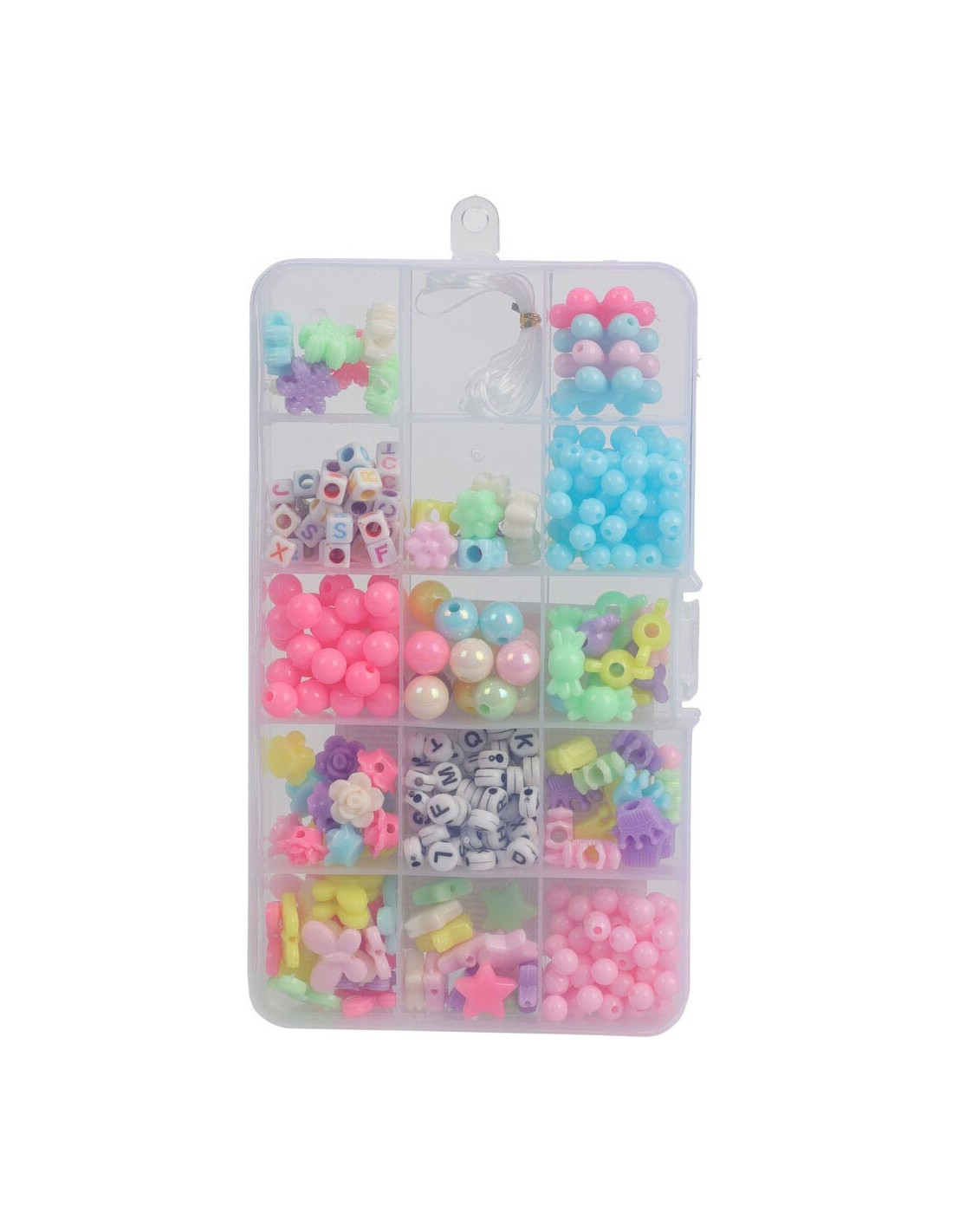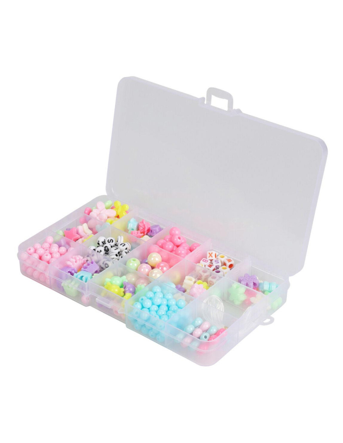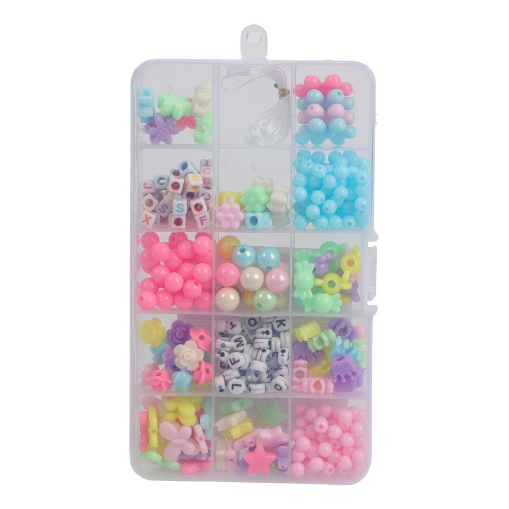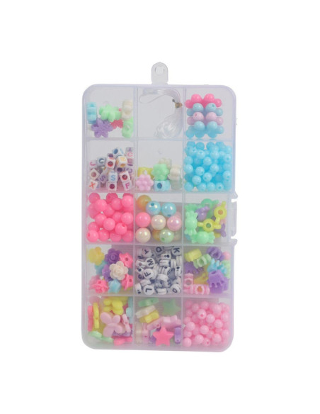 Pastel-/parelmoerkleurige kralenset in kunststof opbergdoos. Deze kralenset voor kinderen heeft 15 vakjes met ronde kralen, letterkralen en kralen in verschillende figuren. Rijgdraad inbegrepen. Geschikt voor kinderen vanaf 5 jaar oud. Afmetingen opbergdoos: 18,5 x 10 centimeter.