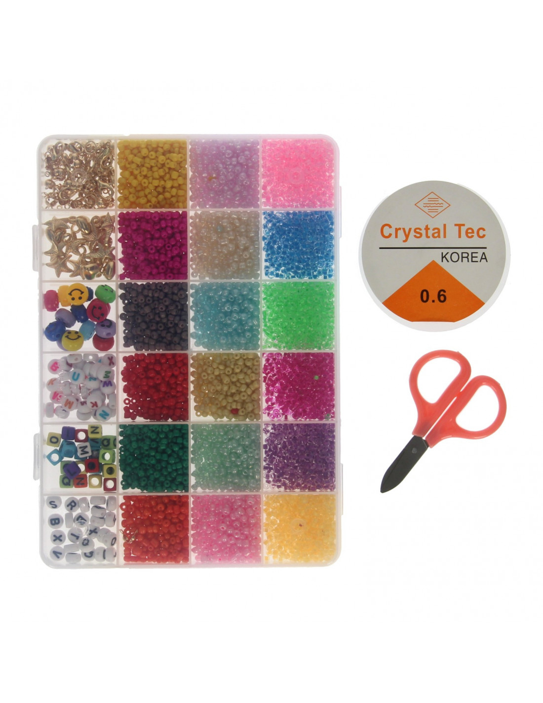 Mooie, luxe set met 28 verschillende soorten kralen, in totaal 300 gram. Met gewone kraaltjes, letterkraaltjes in wit en regenboog, hangertjes en lachgezichtjes. In mooie, doorzichtige PVC-box en inclusief rijgdraad, schaartje, haakjes en oogjes.