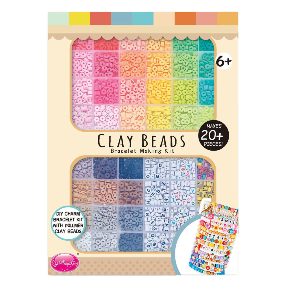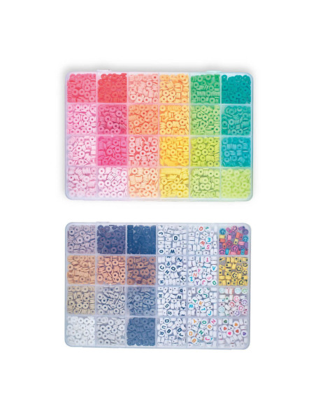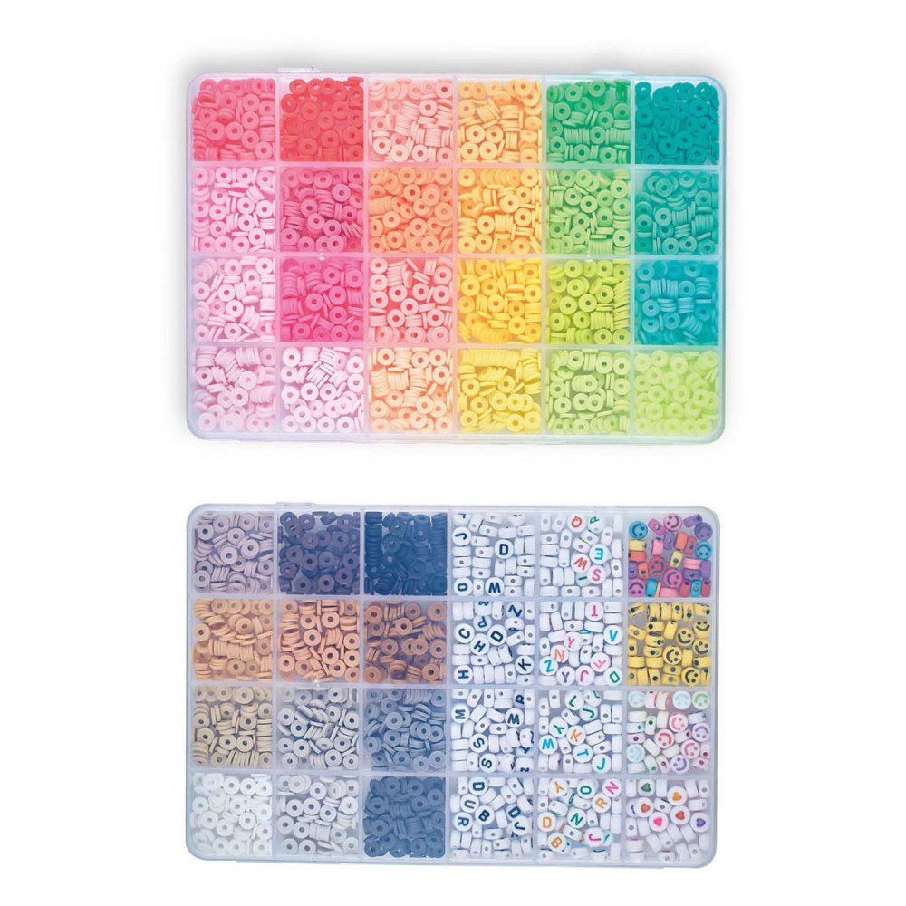 Set met 2 kunststof opbergers met daarin 48 verschillende soorten polymeerkralen. De kralen hebben verschillende multicolor/grijze tinten. Inclusief zwart/witte en gekleurde letterkralen, hartjeskralen en gezichtjeskralen. Afmetingen: 23,6 x 3,4 x 32,6 centimeter. Geschikt voor kinderen en volwassenen, vanaf 6 jaar.