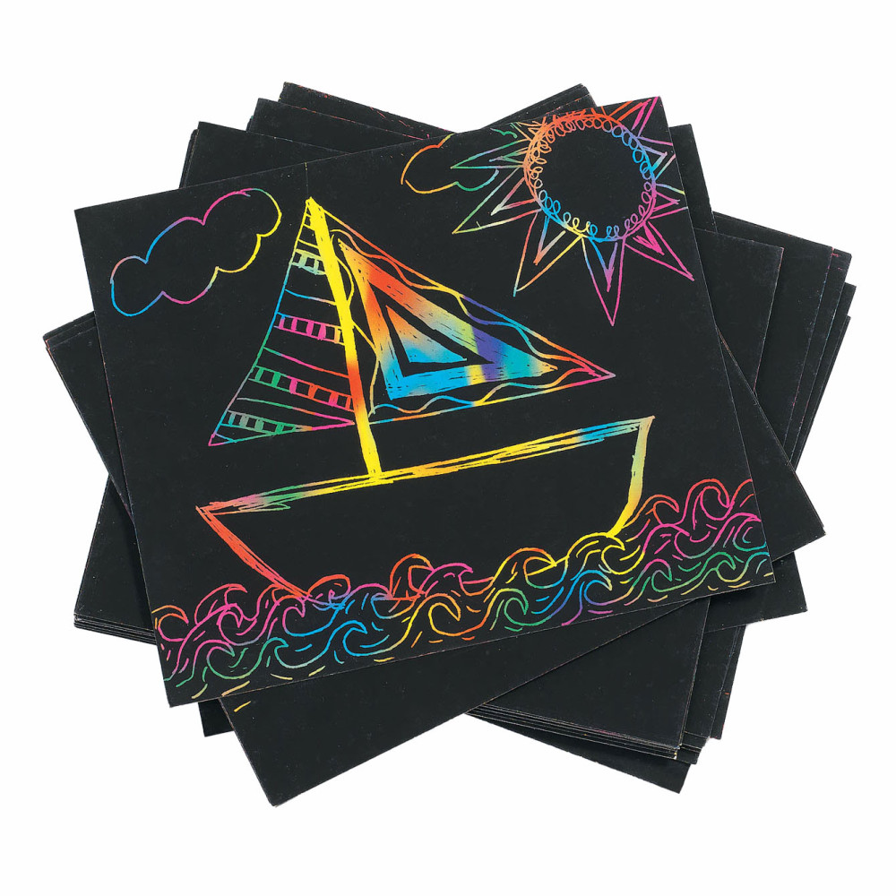 • RAINBOW DESIGN: Laat jonge kunstenaars krabben zich een weg naar prachtige regenboogcreaties met een veelkleurig regenboogpatroon onder de zwarte coating. De vellen zijn elk 15 cm x 15 cm