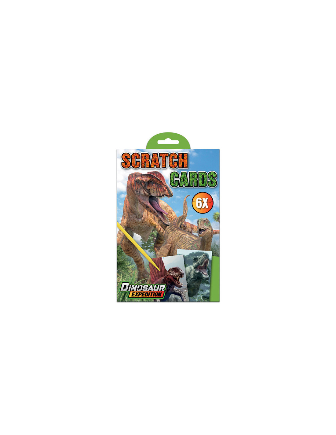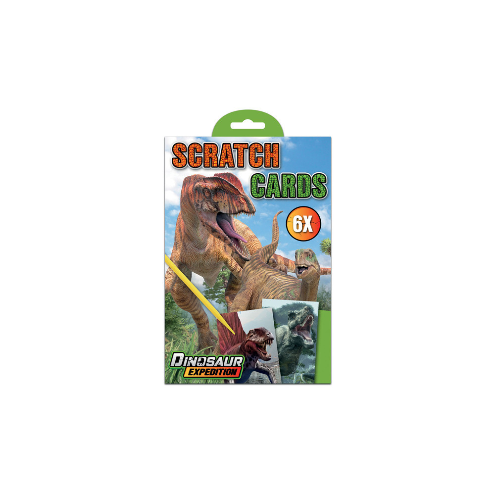 Dinosaurus kraskaarten. In de verpakking zitten 6 kaarten en een kraspen. Geschikt voor kinderen vanaf 3 jaar.