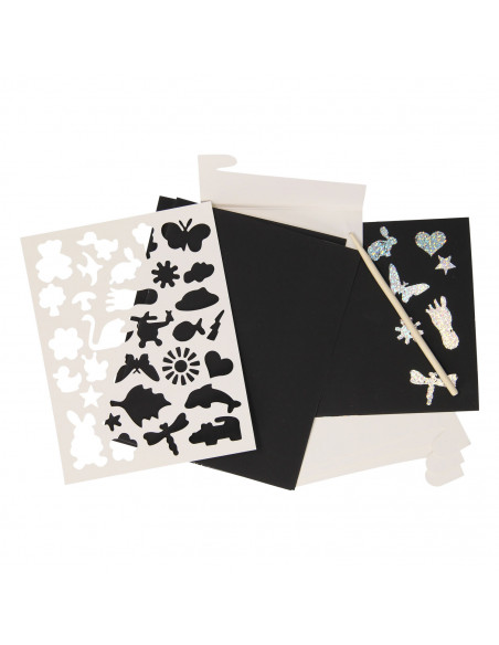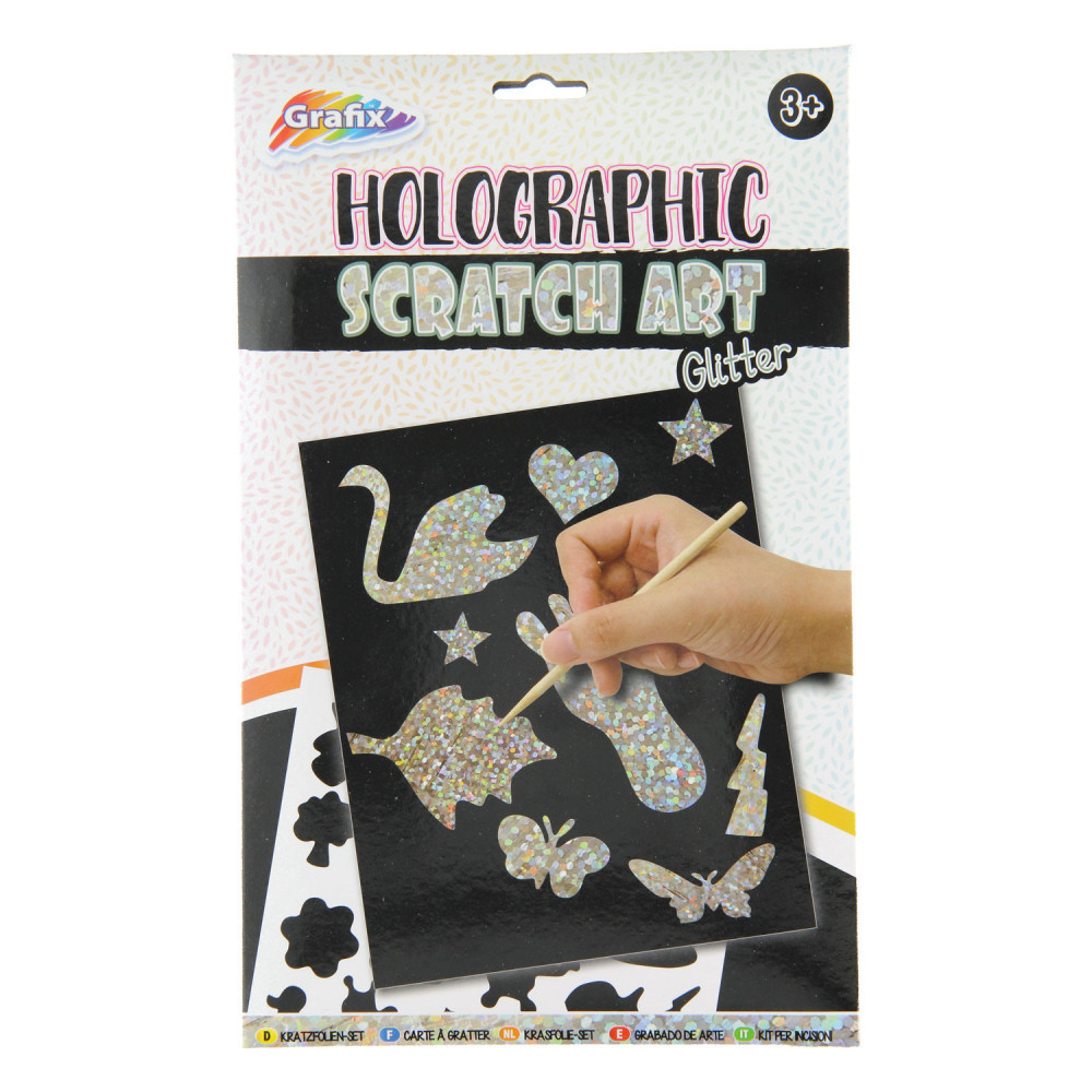 De nieuwste trend van het moment: met de Grafix krastekeningen beleven je kinderen uren krasplezier. Neem de houten pen in je hand en laat stukje per stukje 4 prachtige kunstwerken in het thema Glitter verschijnen.