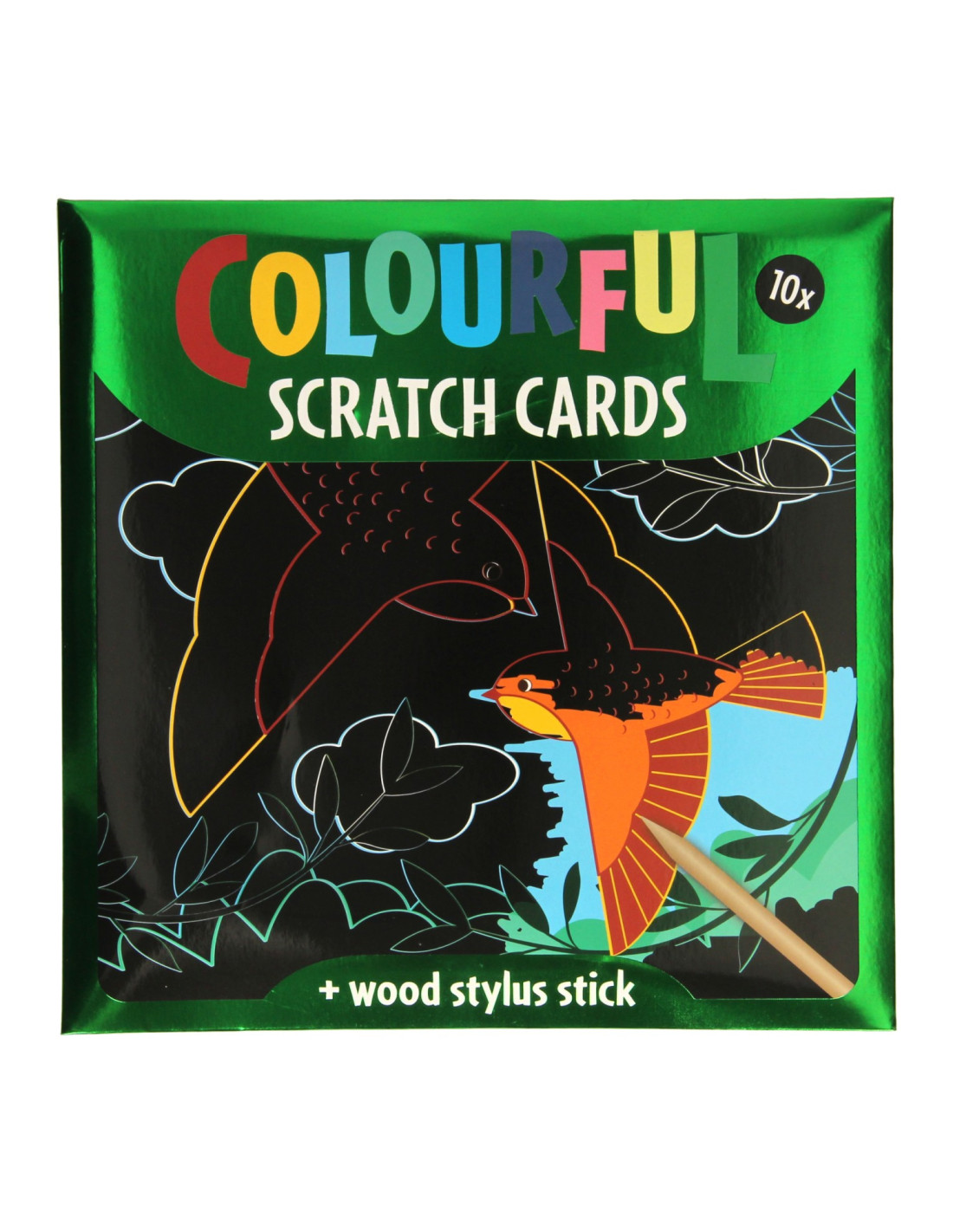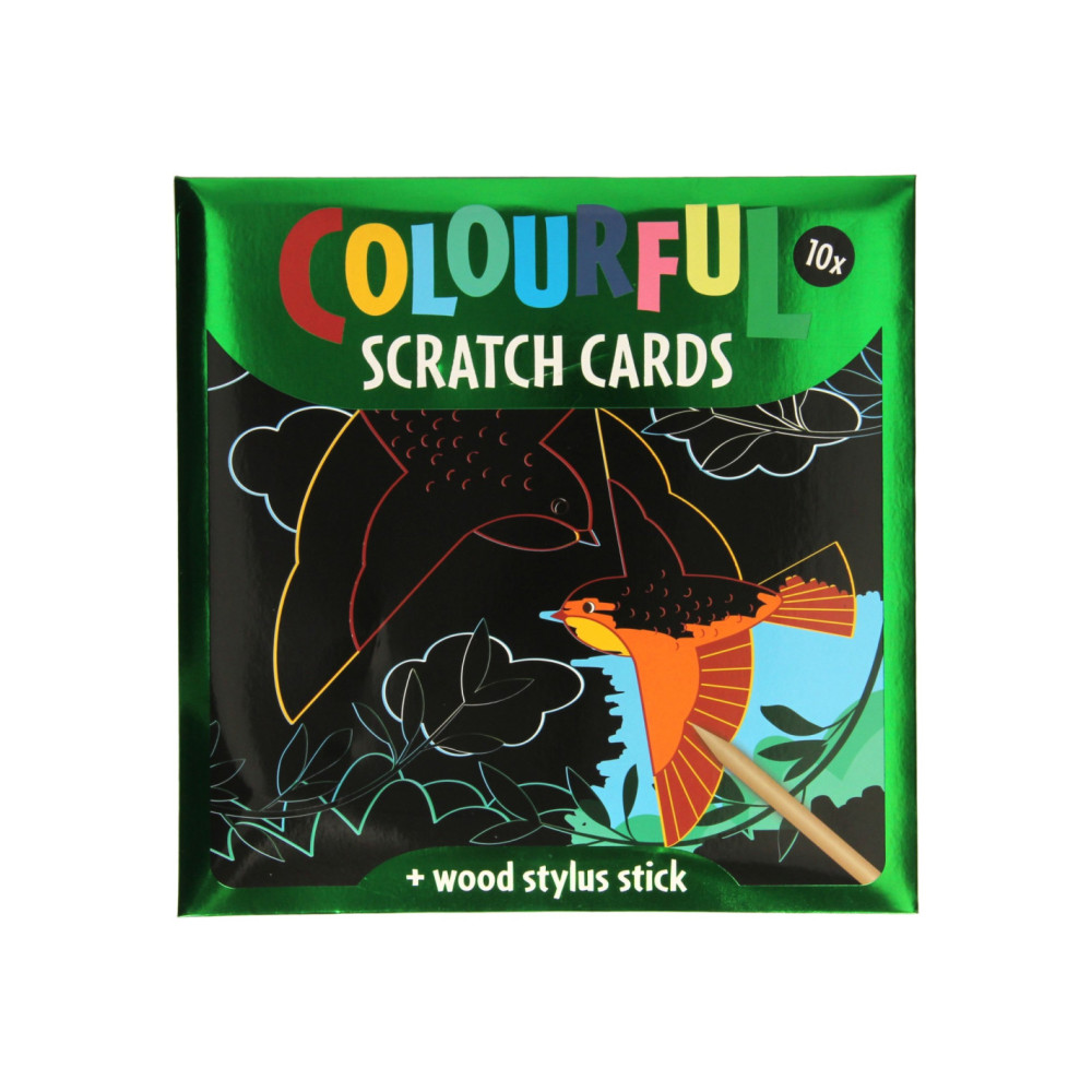 Set van 10 kleurrijke kraskaarten met afbeeldingen van vogels en vlinders. Afmetingen: 22 x 22 centimeter. Inclusief houten kraspen. Geschikt vanaf 3 jaar.