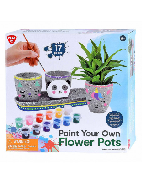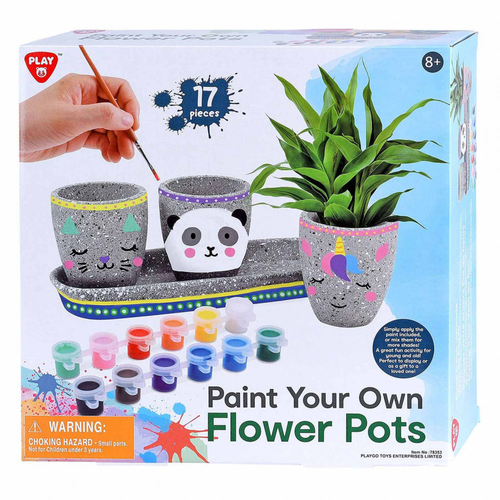 Drie unieke bloempotten, samen op een rij! Met deze schilderset van Play beschilder je zelf drie cementen bloempotjes en een houder. De bloempotten hebben een diameter van ca. 6 centimeter en zijn grijs van kleur. Met bijgeleverde verfpotjes en een penseel.