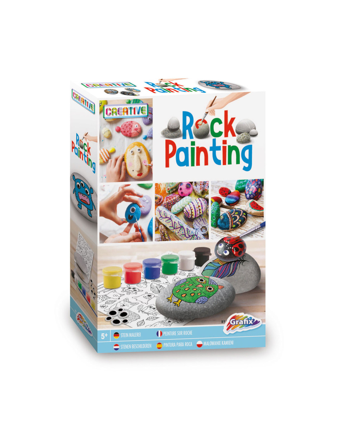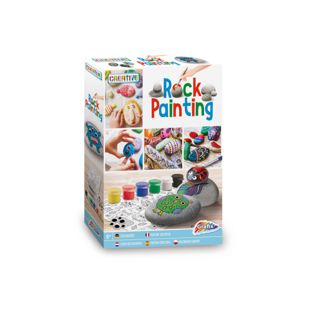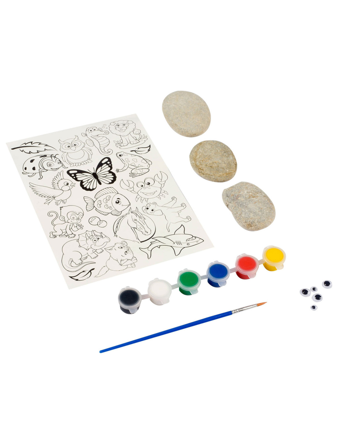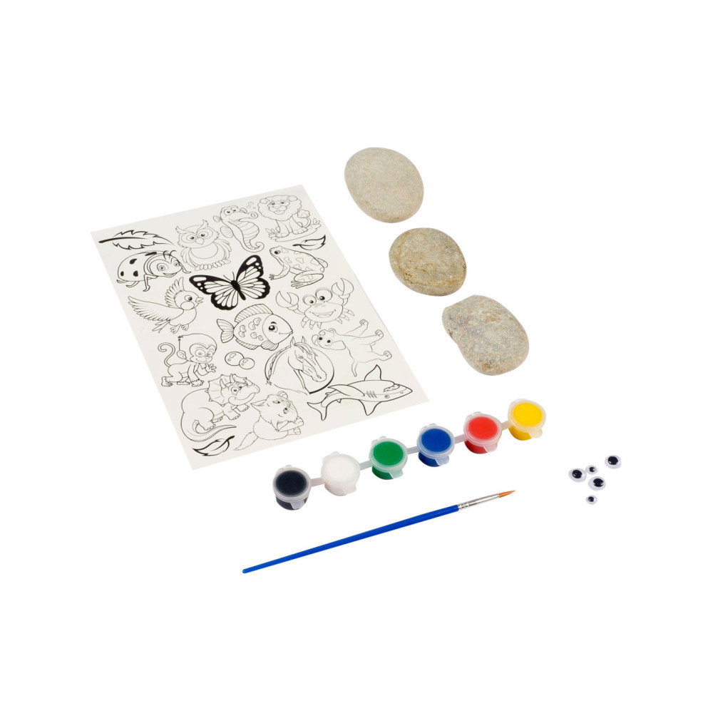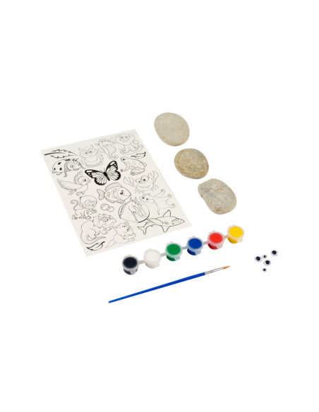 Stenen schilderen knutselset. Beplak de steen met één van de meegeleverde stickers of schilder een zelfbedachte creatie op de steen. De knutselset bestaat uit drie stenen, zes kleine potjes verf, een kwast, een stickervel en een vijftal oogjes.