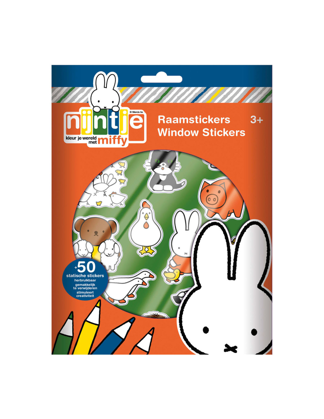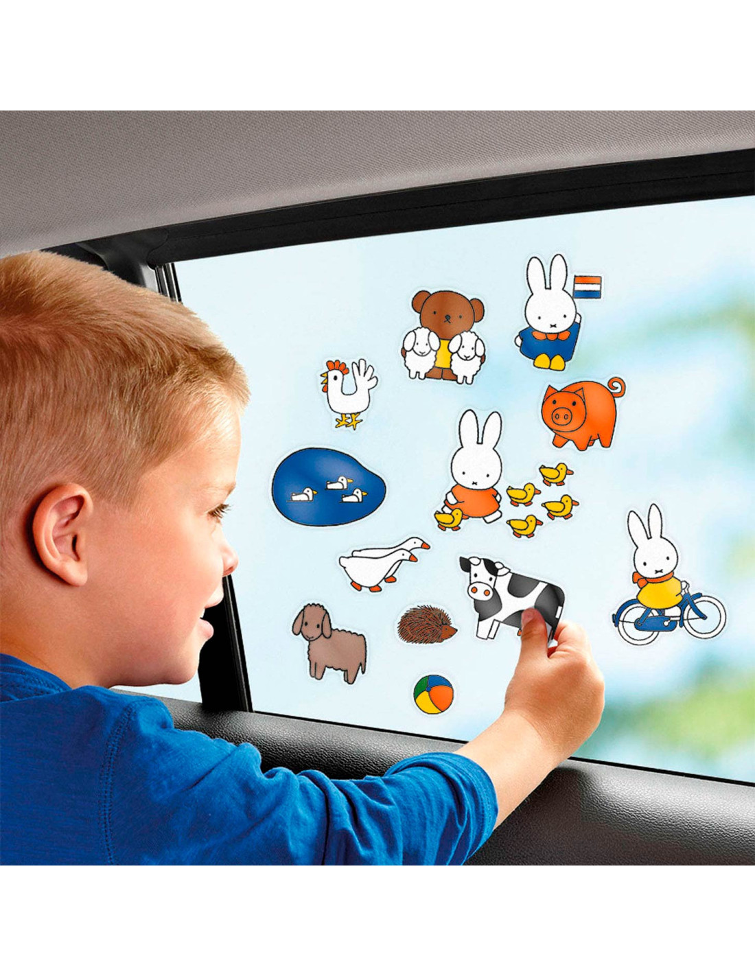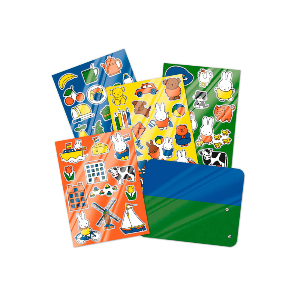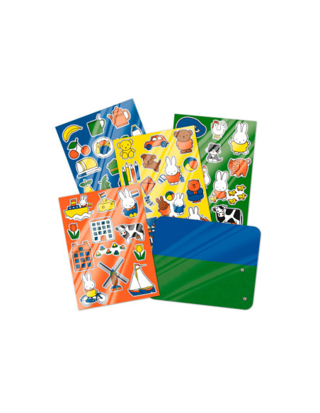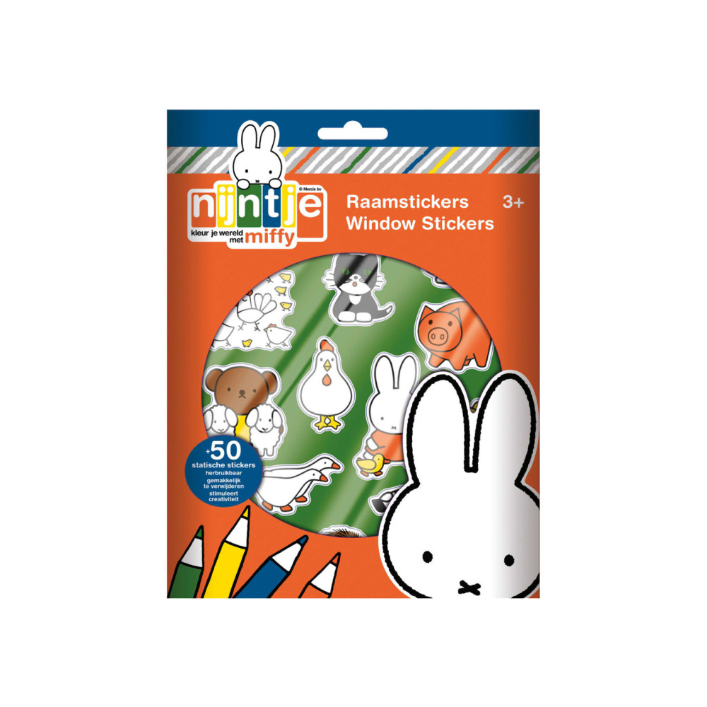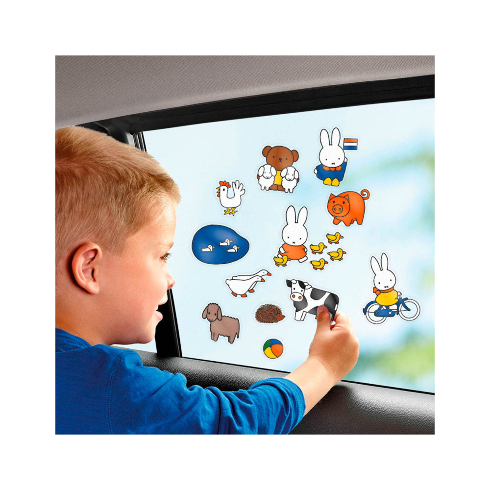 Met deze nijntje raamstickers is verveling geen optie. Gebruik ze in de auto, in huis op de ramen, tegels of spiegels of maak je eigen avonturen door de stickers te gebruiken op de meegeleverde achtergrond. De raamstickers werken zonder gebruik van lijm en kunnen telkens weer opnieuw op een gladde ondergrond worden gebruikt. Deze set bestaat uit 4 velletjes raamstickers in verschillende thema’s zoals Nederland, dieren, eten & drinken en vakantie, en 1 voorbedrukte achtergrond om te beplakken. Leerpunten: oefening van de fijne motoriek, bevordering van creativiteit.