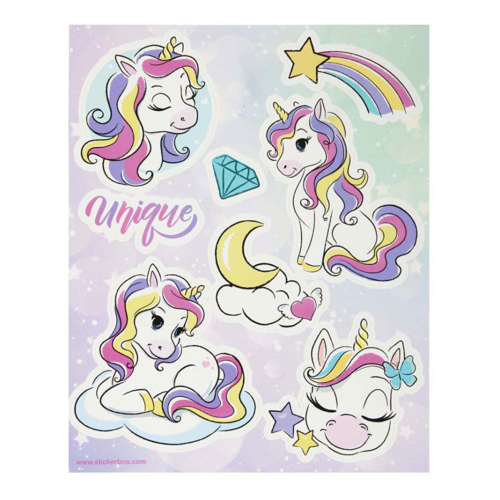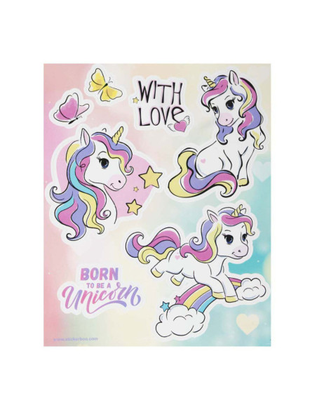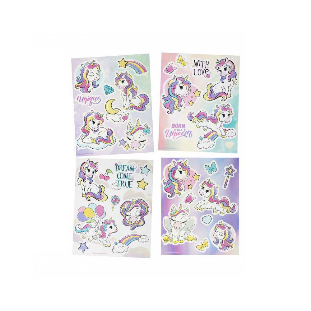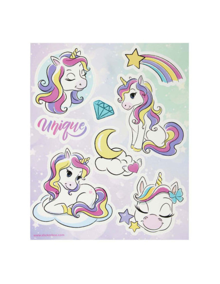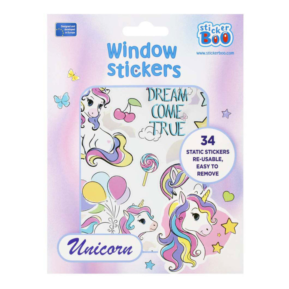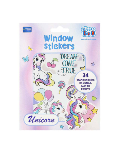 STARPAK raamstickers met afbeeldingen van unicorns, de set bevat 4 sjablonen met 34 stickers die klaar zijn om op het raam te plakken! De stickers zijn hebruikbaar. Afmetingen stickervel: 16 x 21 centimeter.