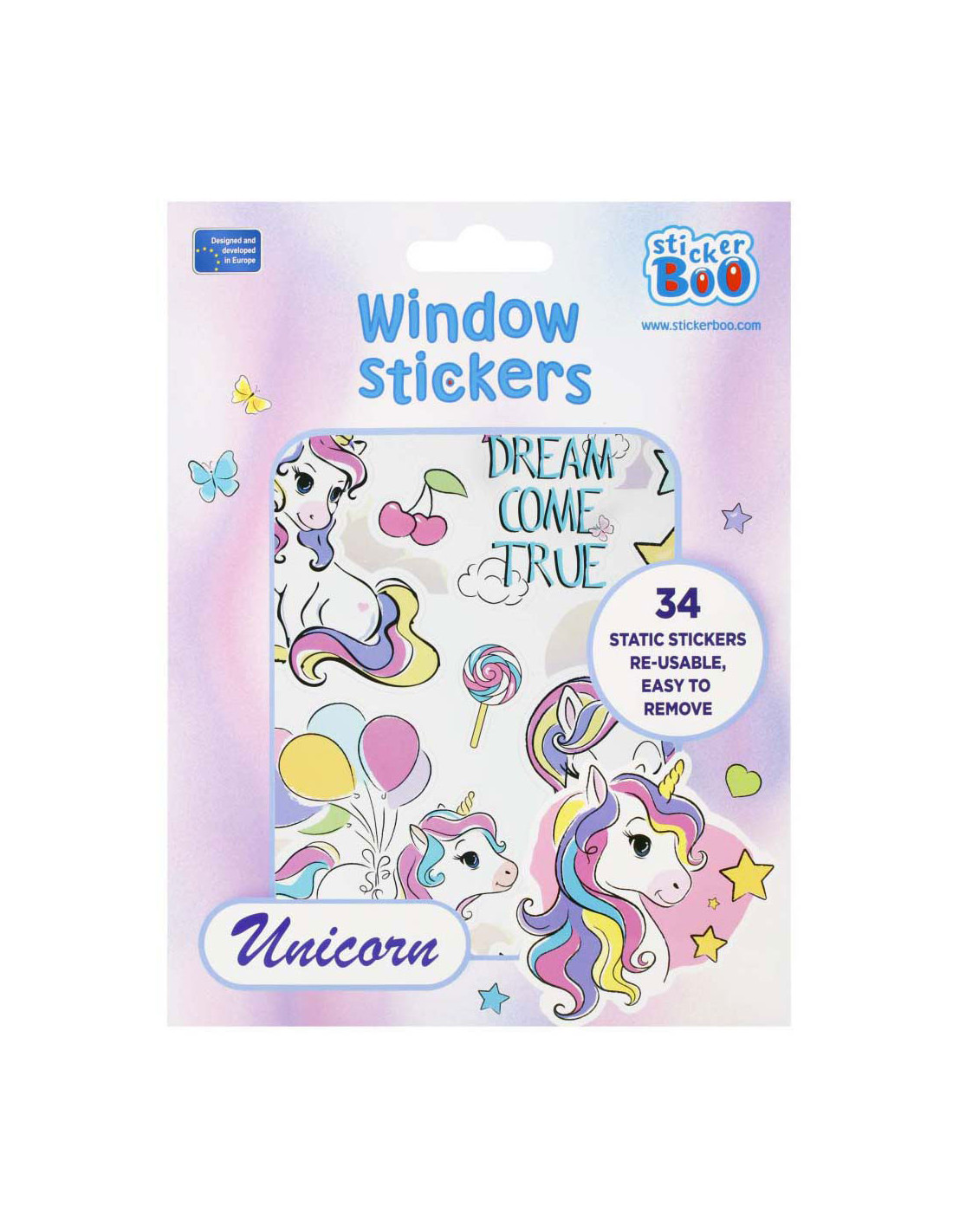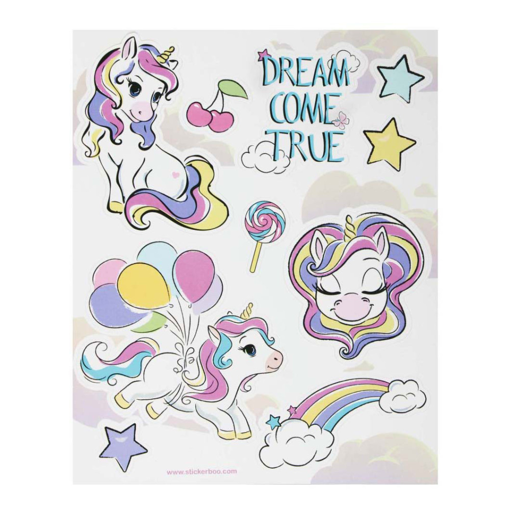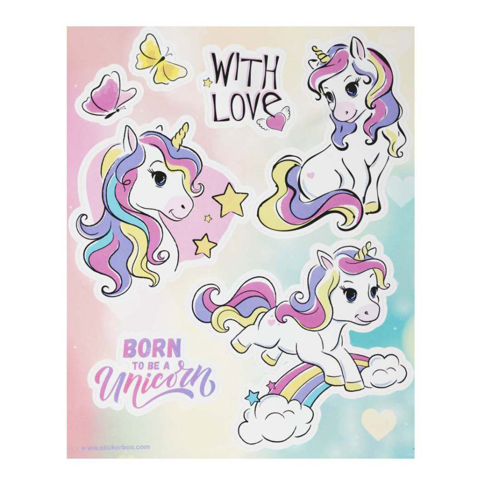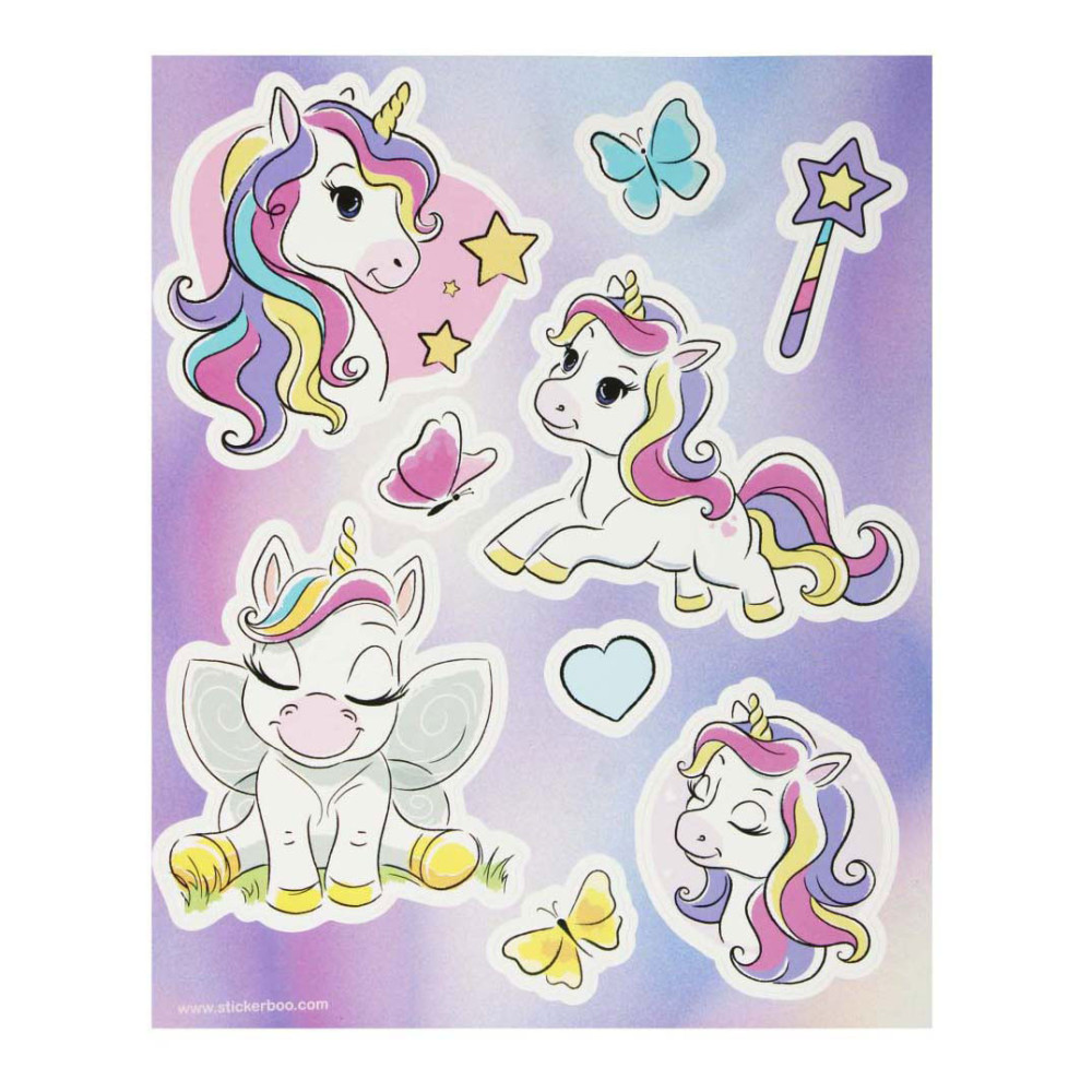 STARPAK raamstickers met afbeeldingen van unicorns, de set bevat 4 sjablonen met 34 stickers die klaar zijn om op het raam te plakken! De stickers zijn hebruikbaar. Afmetingen stickervel: 16 x 21 centimeter.