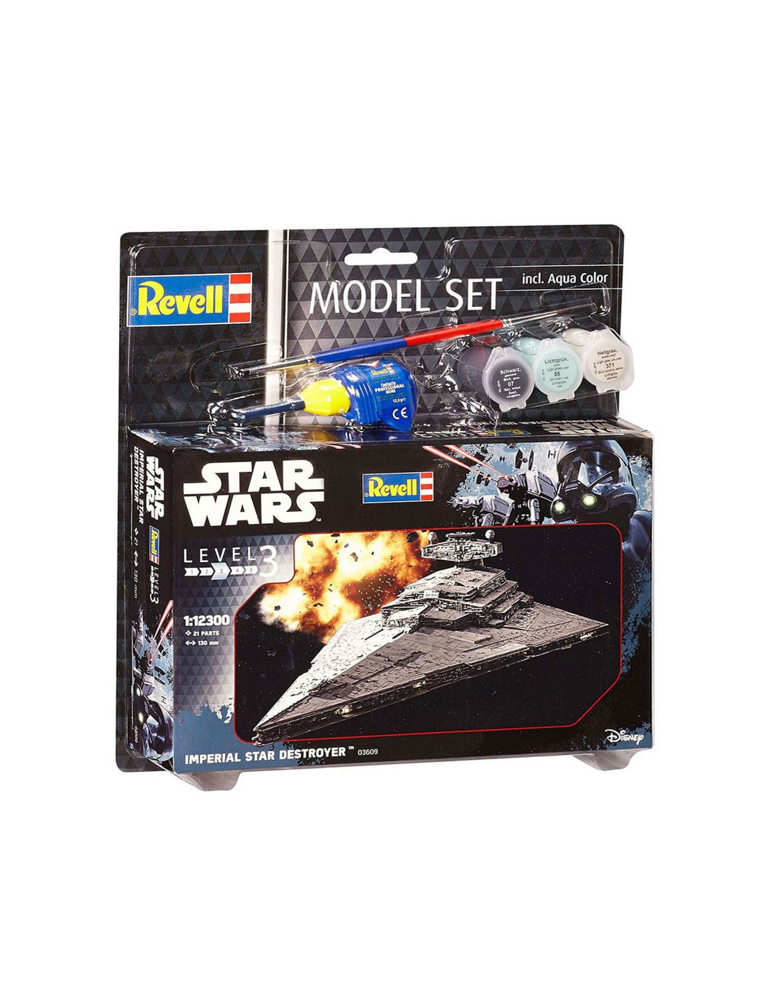 Revell Model Set Imperial Star Destroyer vliegtuig uit de film Star Wars. De set bestaat uit 21 onderdelen heeft een schaal van 1:12300 en een moeilijkheidsgraad level 3. Inclusief 3 kleuren verf, lijm en een penseel. Geschikt vanaf 10 jaar.