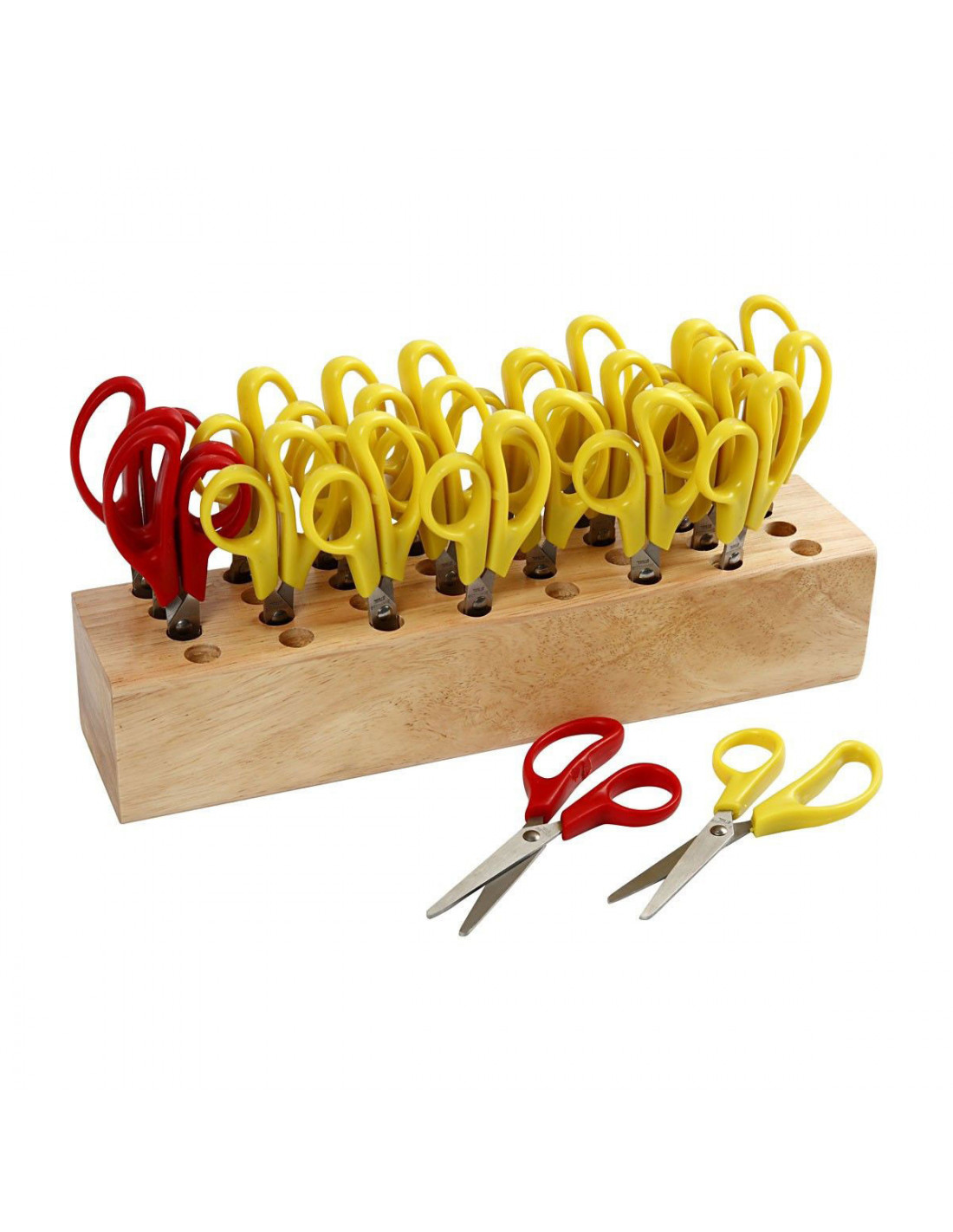 Uitstekende kinderscharen geschikt voor diverse hobbyprojecten. De set bevat 20 rechtshandige, 4 linkshandige scharen en een houten opbergrek. Lengte 12,5 cm.