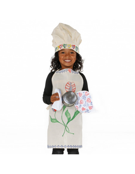 Dit prachtige katoenen kinderschort is niet alleen een creatief project, maar ook een praktische toevoeging aan elke keuken of knutselruimte. Gemaakt van Fair Trade katoen, draagt het ook bij aan een rechtvaardigere wereld.
