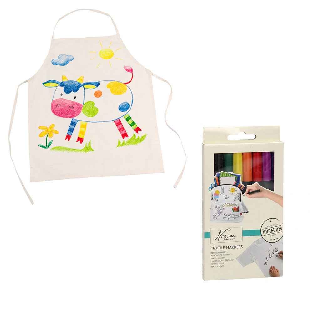 Stimuleer de creativiteit van jonge kunstenaars met onze Kleur je eigen Schort, compleet met een set textielstiften! Dit is een bundel van 4 stuks. Elk schort is een blanco canvas, klaar om gevuld te worden met de verbeelding van de drager.