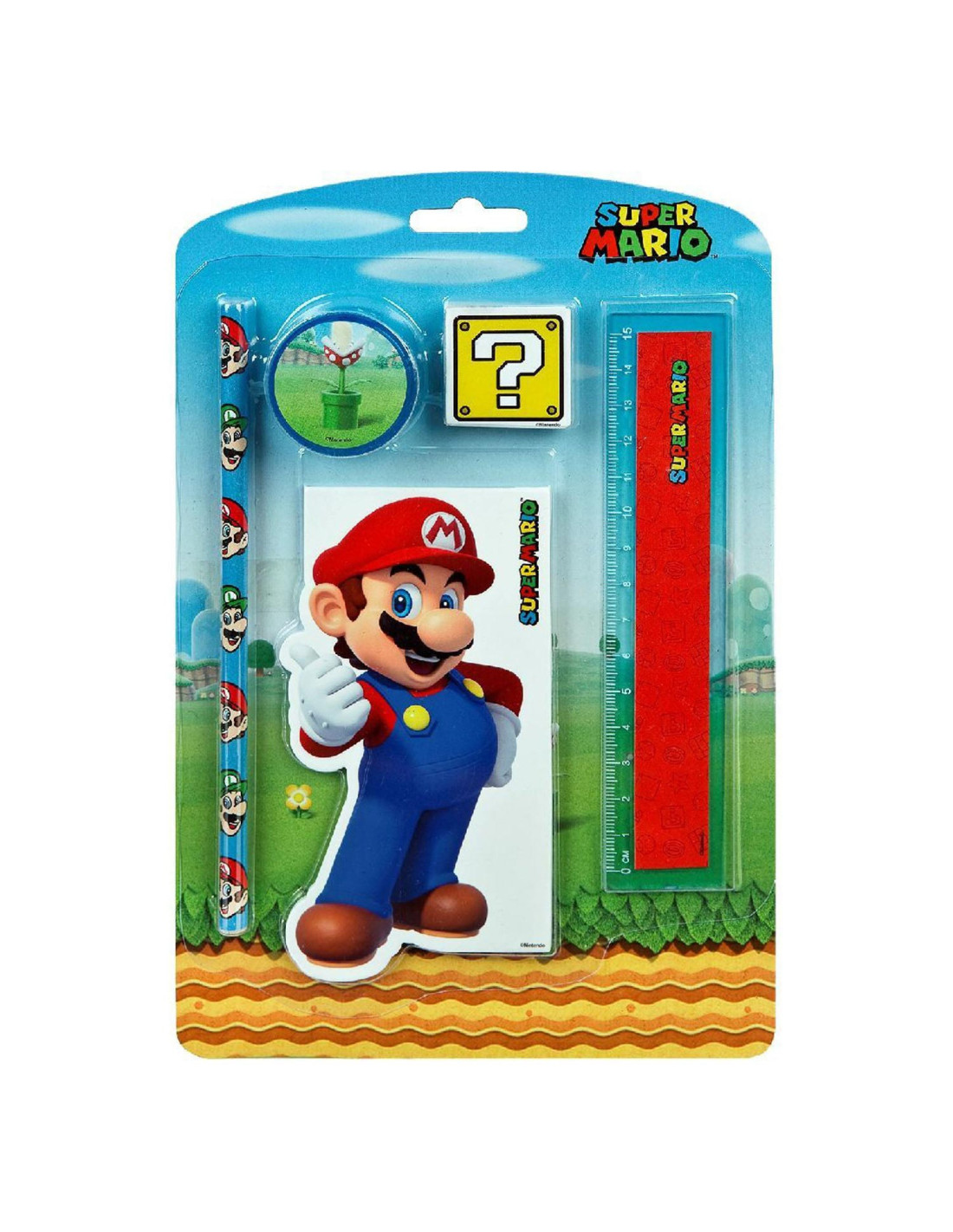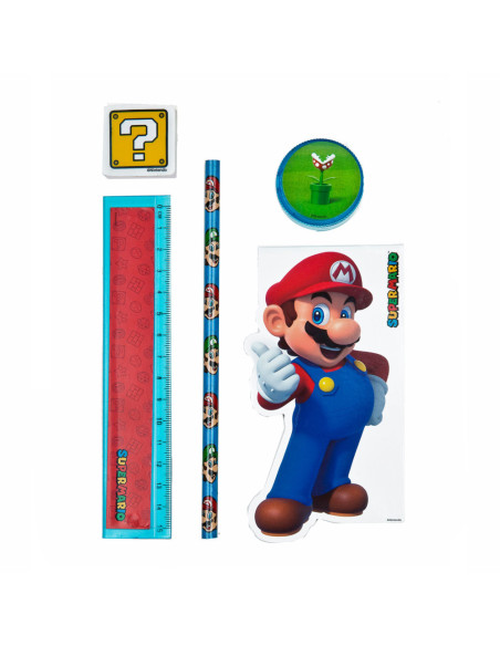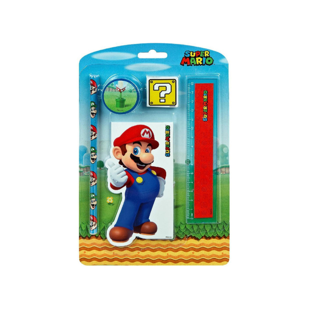 Super Mario set met potlood, puntenslijper, gum, notitieblokje en liniaal. Geschikt voor kinderen van 3 tot 12 jaar oud.