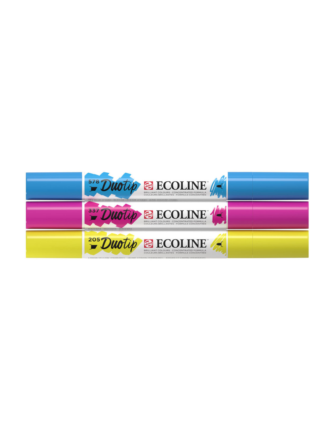 Ecoline Duotip pennen bevatten geconcentreerde, transparante waterverf. Deze briljante kleuren in combinatie met de twee verschillende penpunten, een smalle kogelvormige en een bredere beitelvormige punt, geven je de vrijheid om fijne of brede lijnen te maken en om grotere vlakken in te kleuren. De op kleurstof gebaseerde Duotips werken perfect in combinatie met de Ecoline Brush Pens en Ecoline flacons en bieden je een breed scala aan opties in lijndiktes, stijlen en kleurvariaties. Dit maakt de Duotip uitermate geschikt voor tekeningen en illustraties met grote kleurblokken, maar ook voor lijnwerk en kleine details.