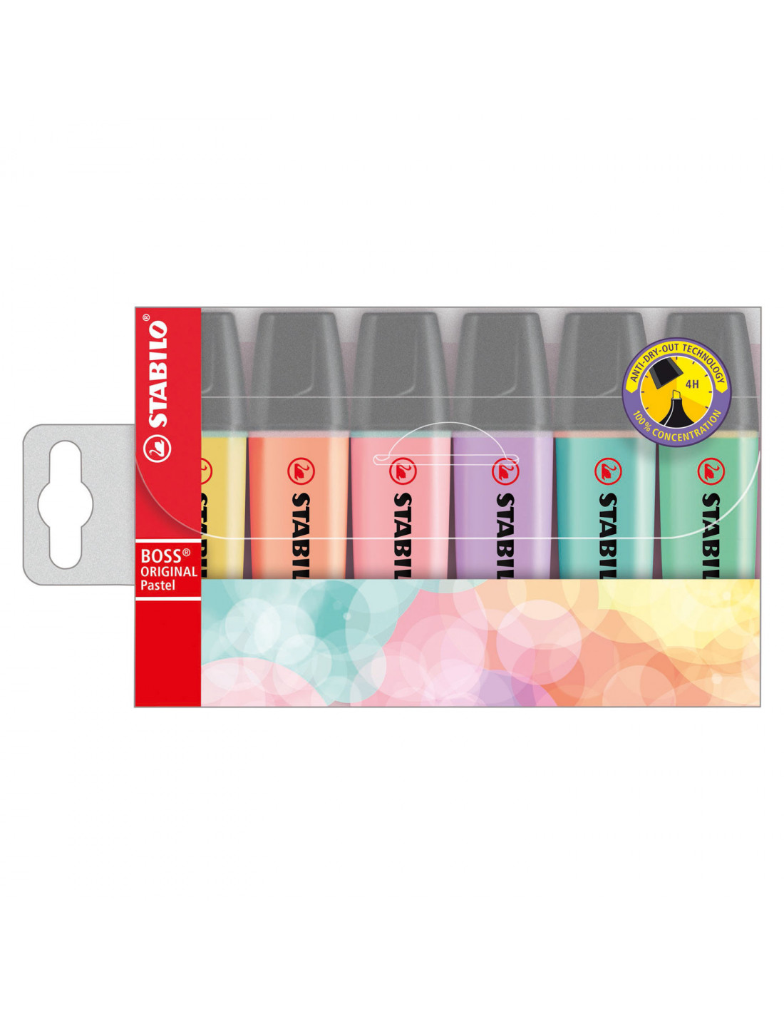 Set van 6 STABILO Boss Original pastel markeerstiften. Inkt op waterbasis en eenvoudig navulbaar.