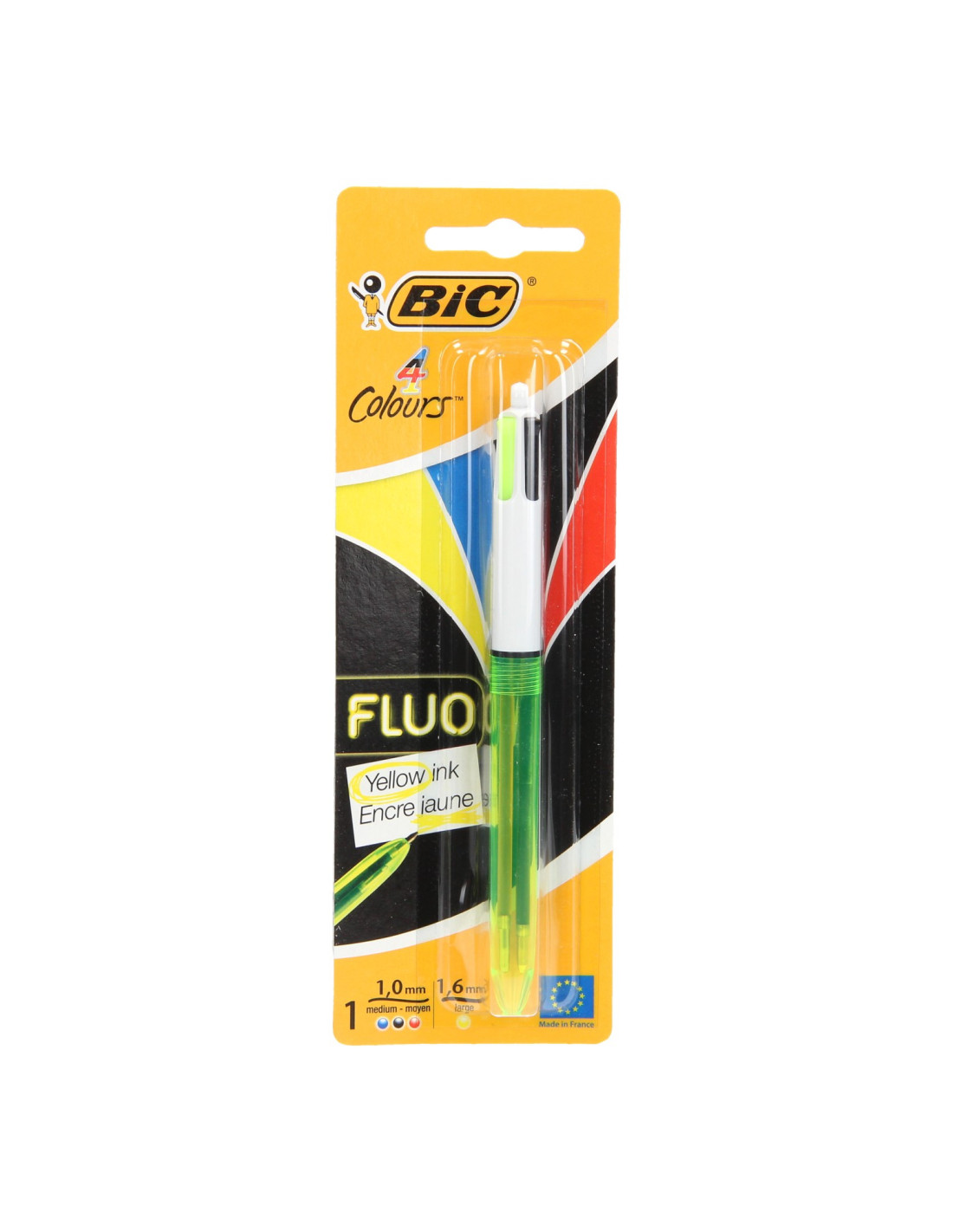 BIC 4 kleurenpen met een inschuifbare punt. Een kleur (geel) met een puntdikte van 1.6 mm voor een brede lijn. Drie kleuren (blauw, zwart en rood) met een puntdikte van 1.0 mm voor lijnen van een gemiddelde breedte.