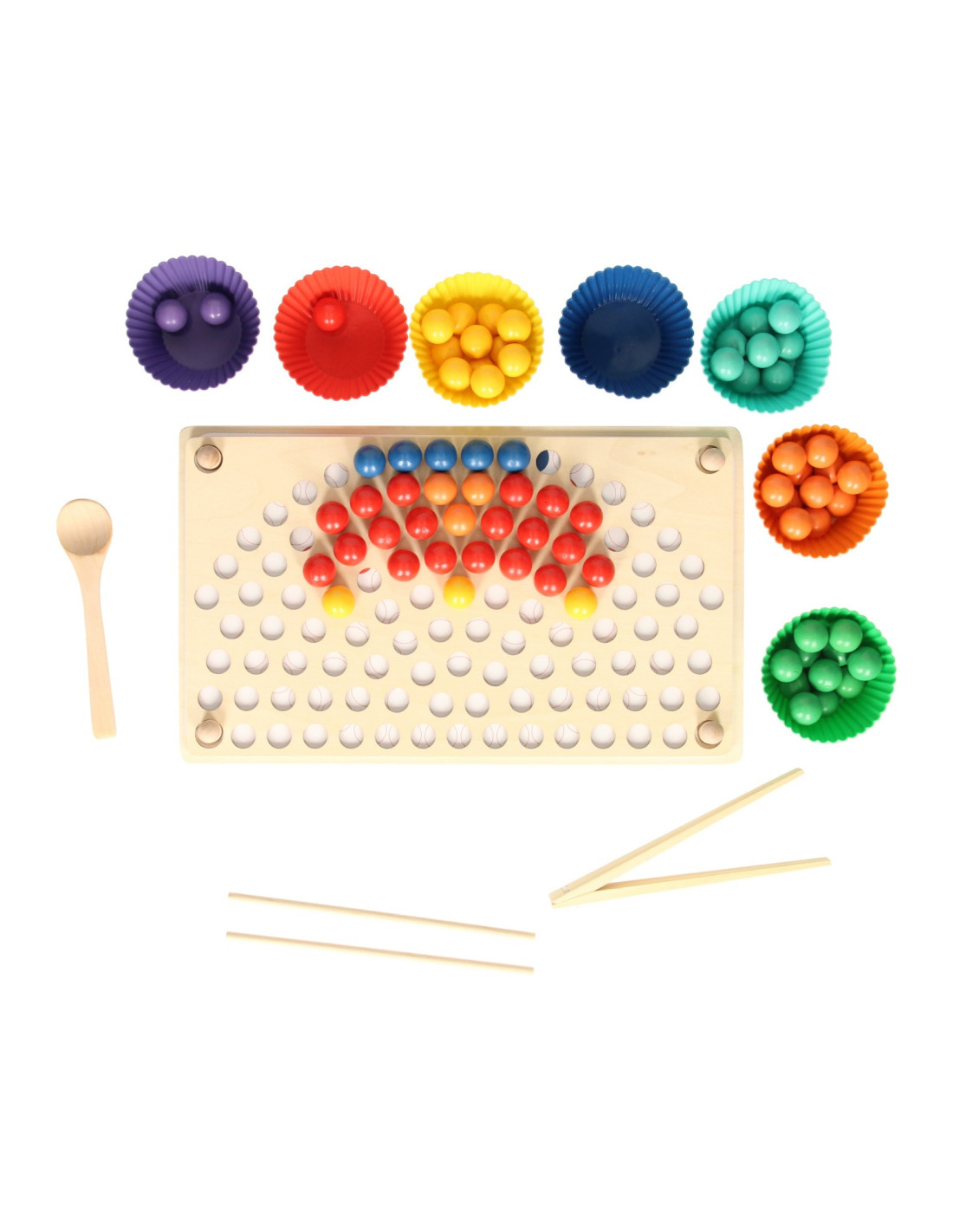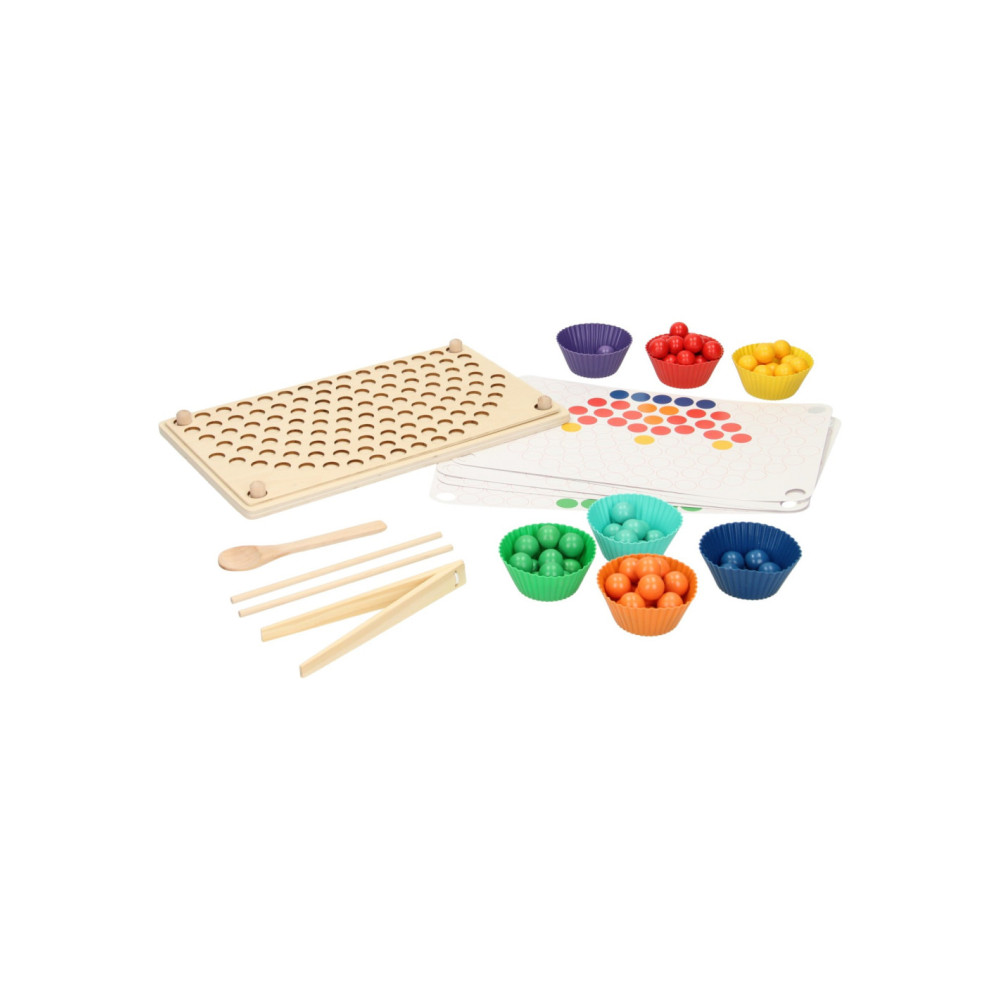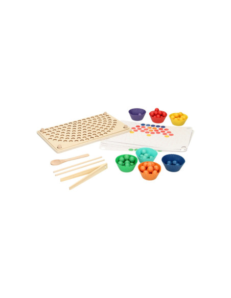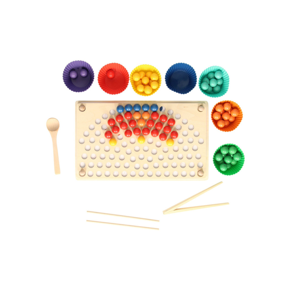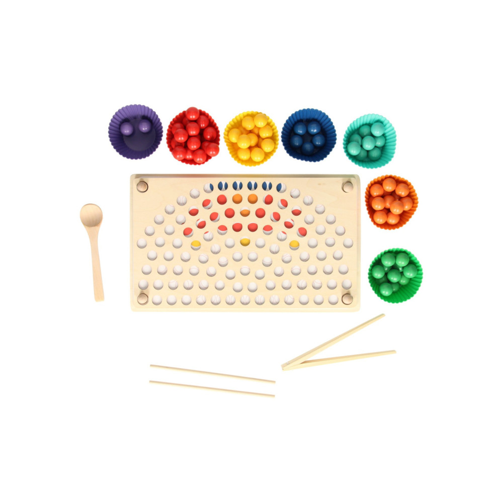 Regenboog kleurenspel waarbij je met de verschillende kleuren balletjes allerlei leuke patronen kunt namaken op het houten legbord. Inclusief sorteerbakjes en houten gereedschap voor het makkelijk hanteren van de balletjes. Een leuk en leerzaam spel dat ondersteunt bij de ontwikkeling van kleurherkenning, de fijne motoriek en hand-oogcoördinatie.