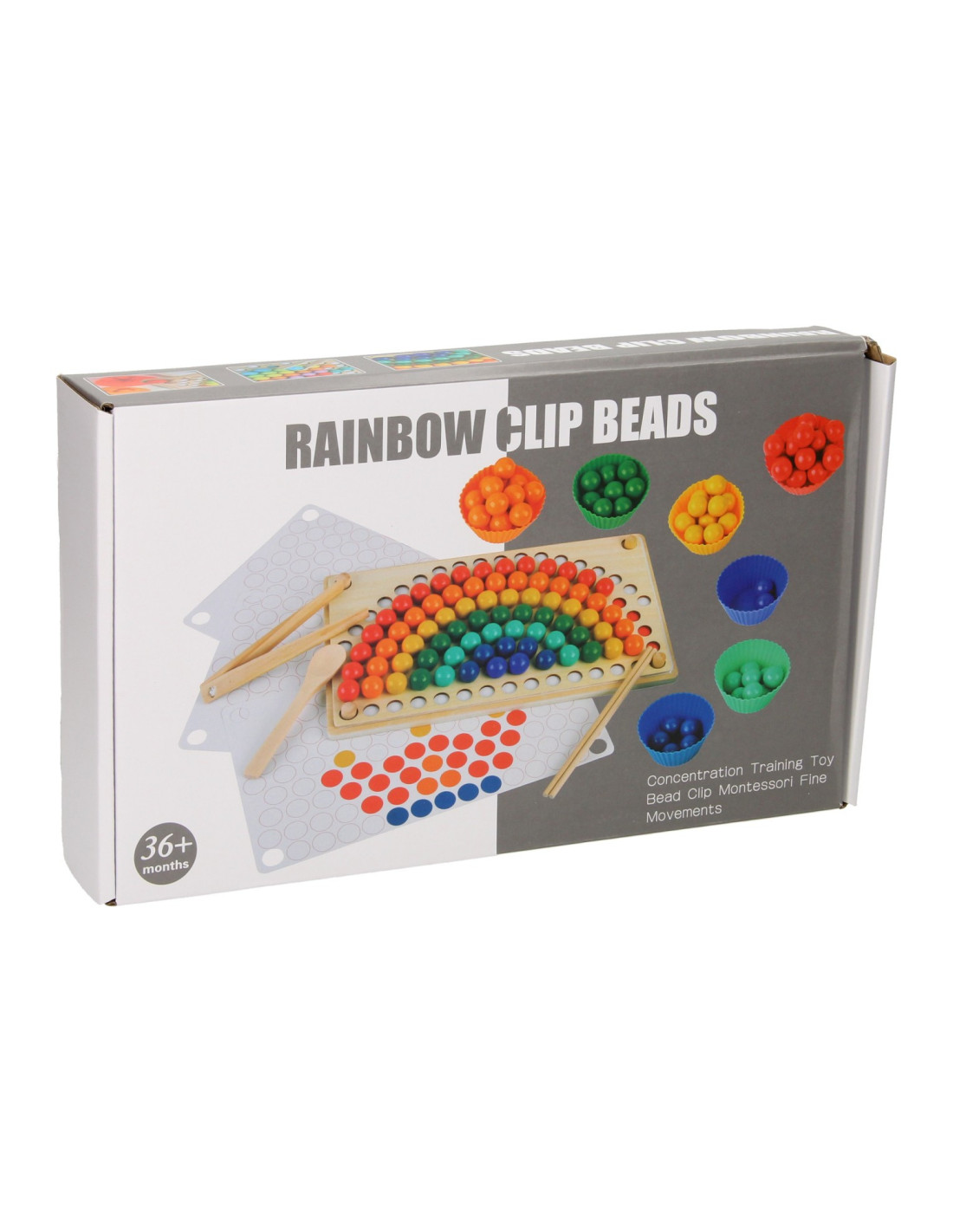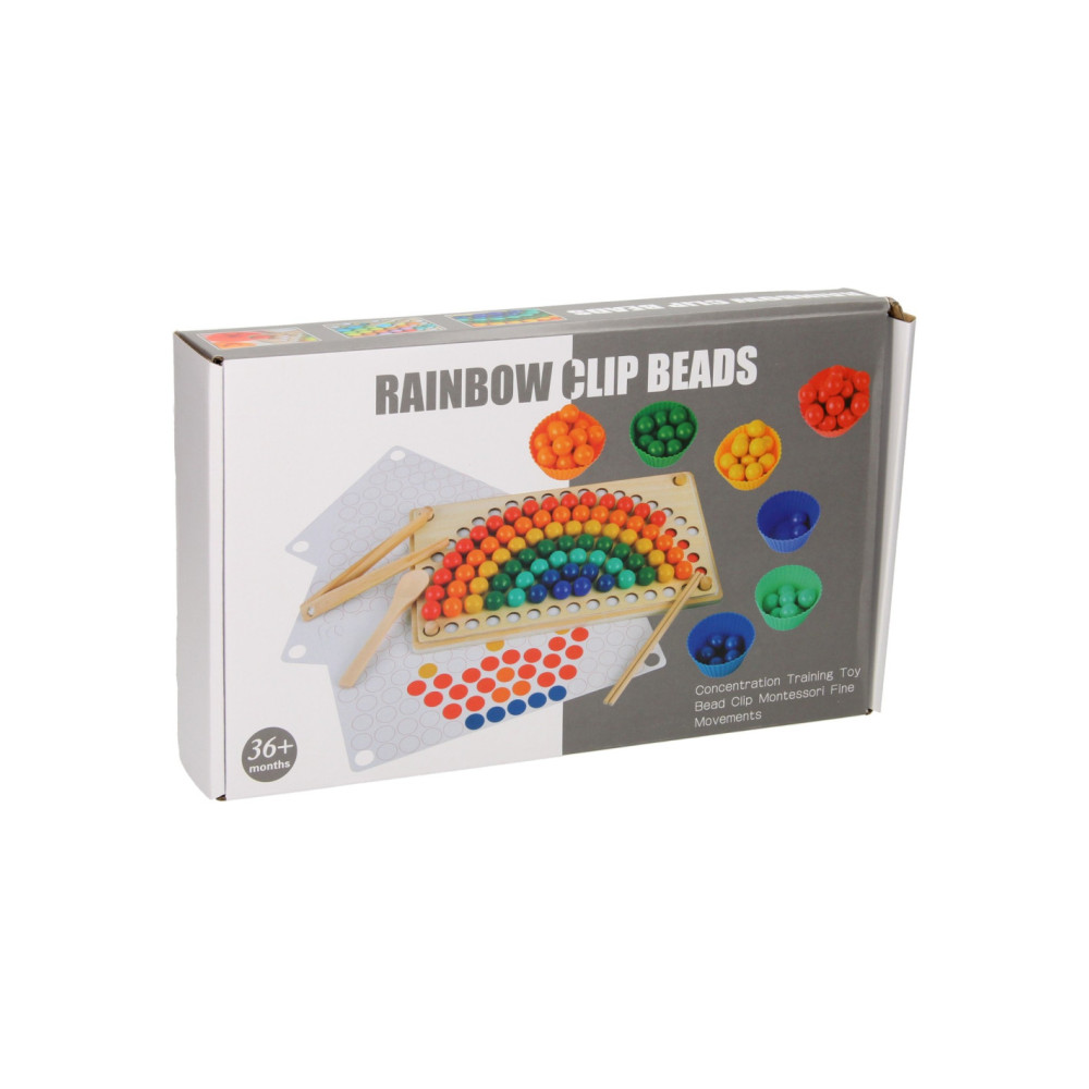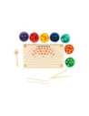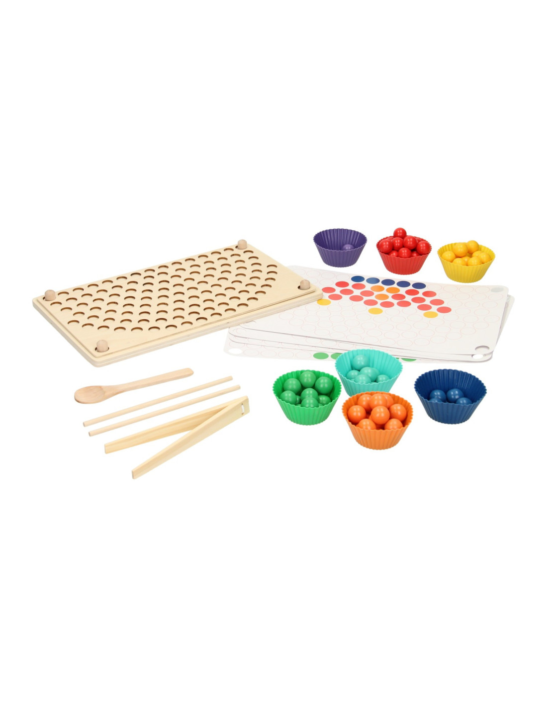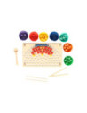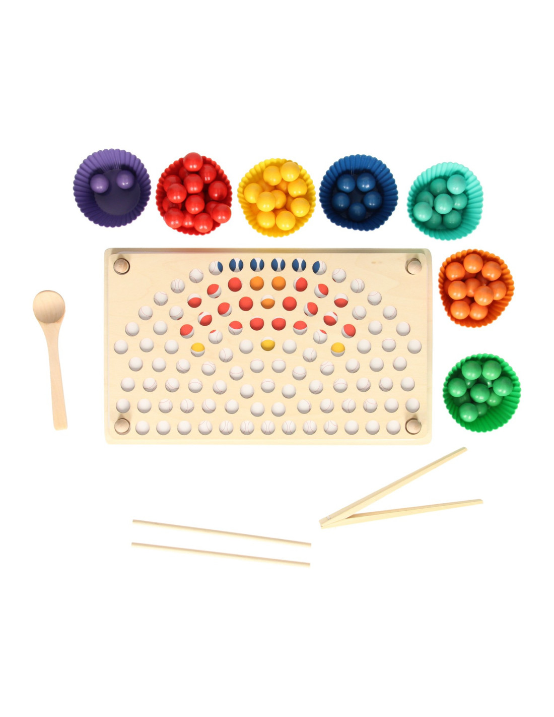 Regenboog kleurenspel waarbij je met de verschillende kleuren balletjes allerlei leuke patronen kunt namaken op het houten legbord. Inclusief sorteerbakjes en houten gereedschap voor het makkelijk hanteren van de balletjes. Een leuk en leerzaam spel dat ondersteunt bij de ontwikkeling van kleurherkenning, de fijne motoriek en hand-oogcoördinatie.