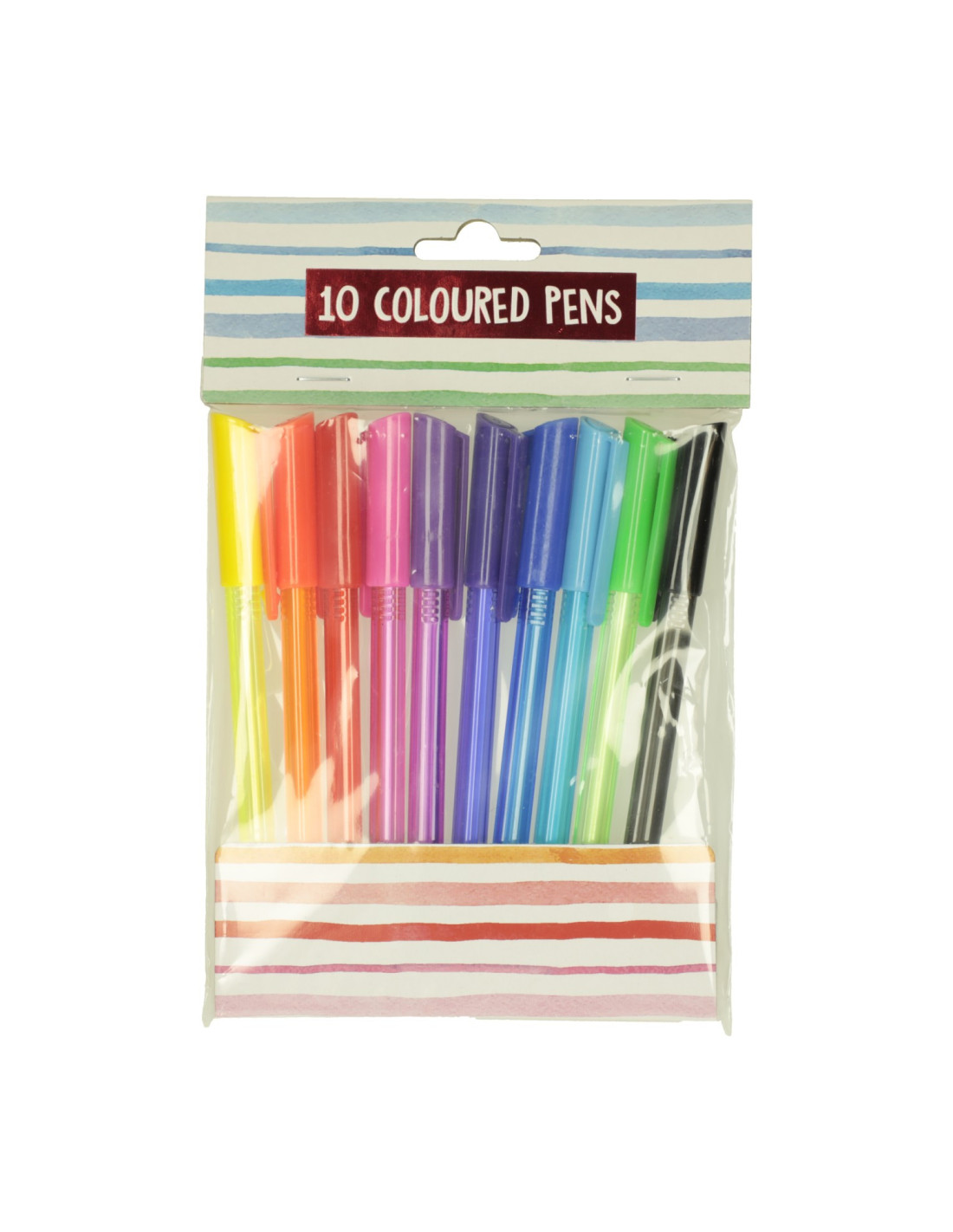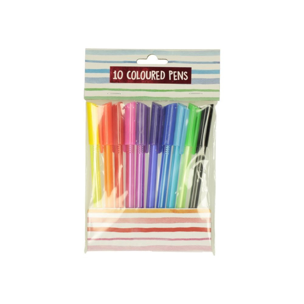 Verpakking met kleurrijke gelpennen. De verpakking bevat 10 gelpennen in geel, oranje, rood, roze, paars, donkerblauw, lichtblauw, groen en zwart.