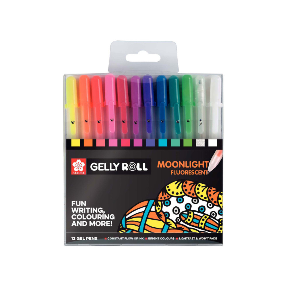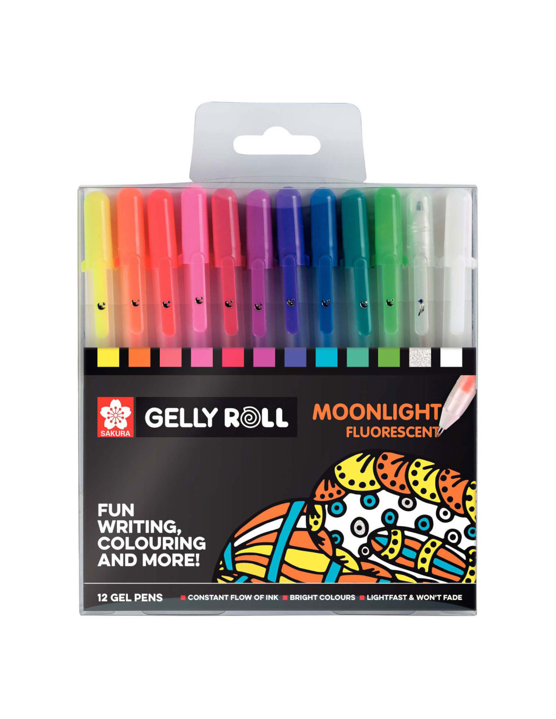 Een unieke collectie van de 10 mooiste kleuren Moonlight gelpennen, 1 Clear Stardust gelpen, en 1 Basic Wit gelpen. Deze set bevat één stuk van elke felgekleurde fluorescerende Moonlight-gelpen in de kleur Fluorescerend Geel (403), Fluorescerend Oranje (405), Fluorescerend Vermiljoen (418), Fluorescerend Roze (420), Rood (419), Rozenrood (421), Paars (424), Blauw (436), Groen (429), Fluorescerend Groen (427), 1 Clear Stardust gelpen (700) en 1 Basic Wit gelpen (50).
