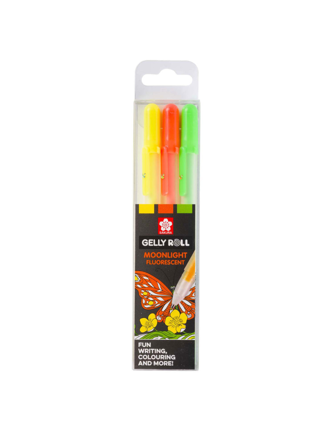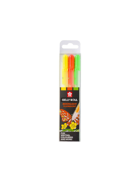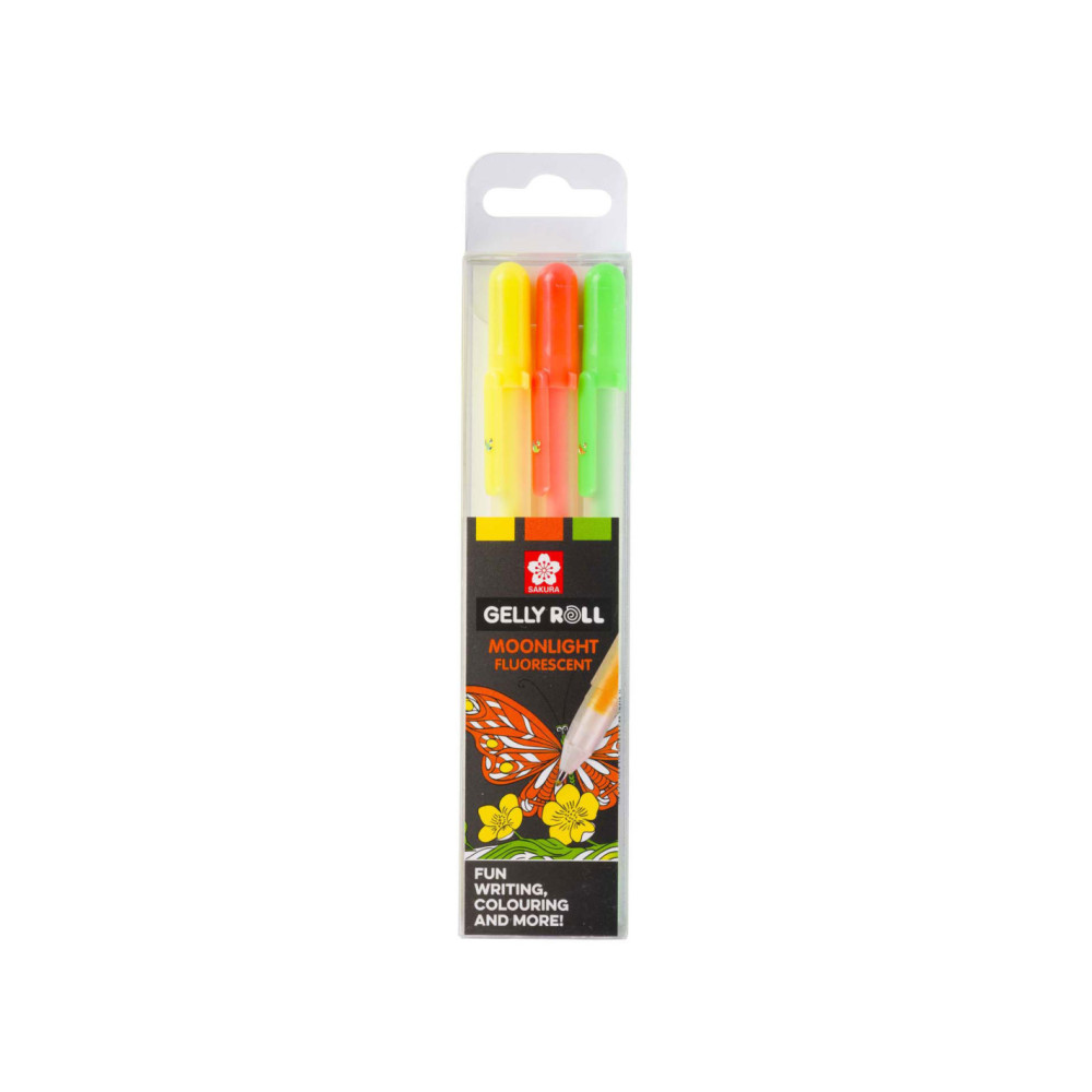 De Happy-set bestaat uit 3 felgekleurde Moonlight gelpennen voor een uniek en eigen kleurig fluorescerend effect. De collectie bestaat uit Fluorescerend Geel (403), Fluorescerend Oranje (405) en Fluorescerend Groen (427).