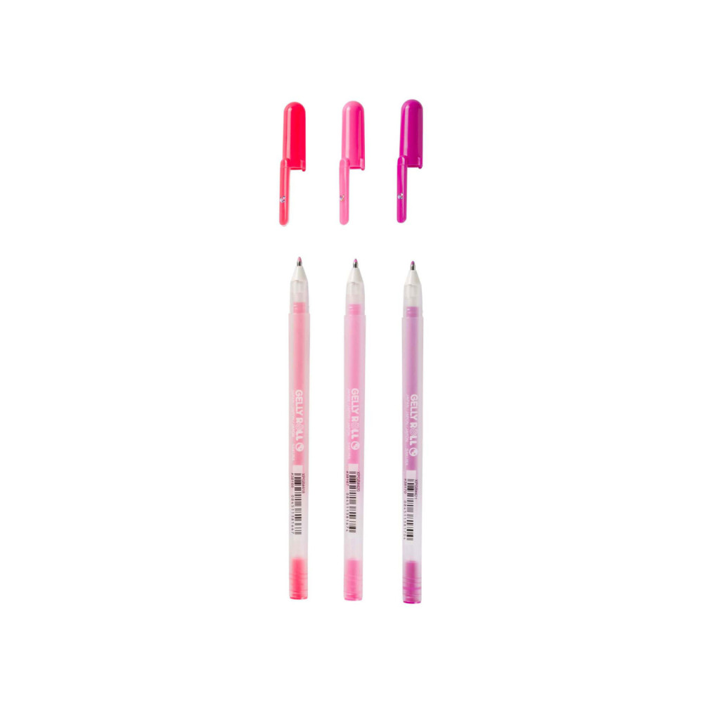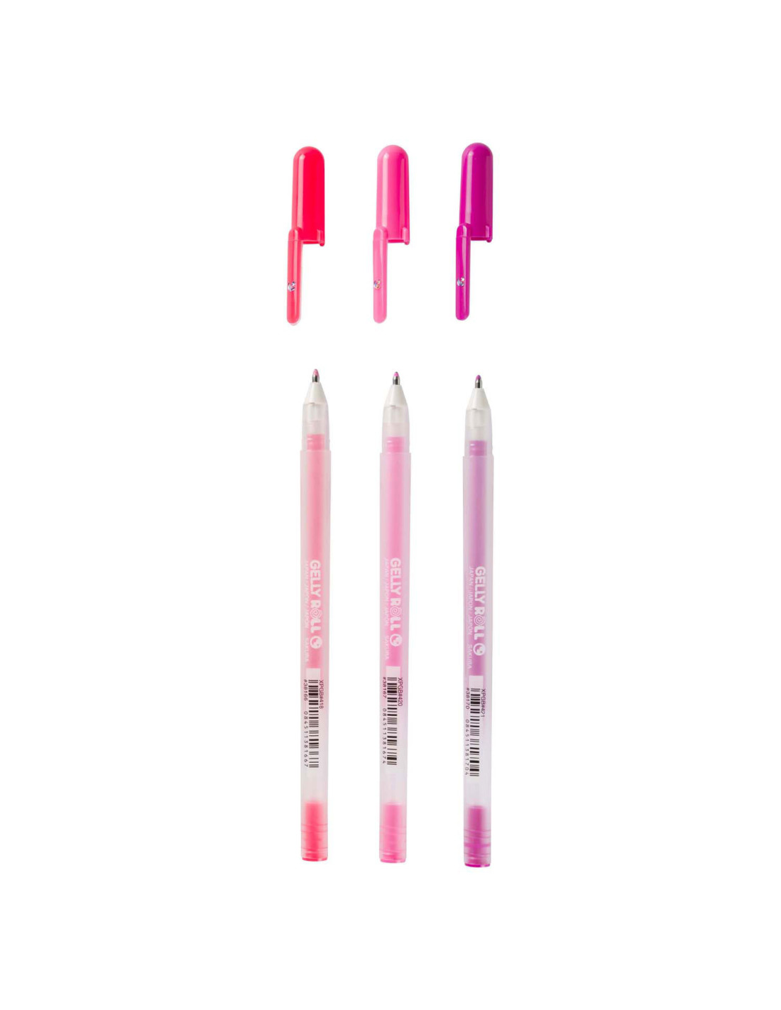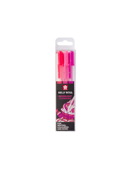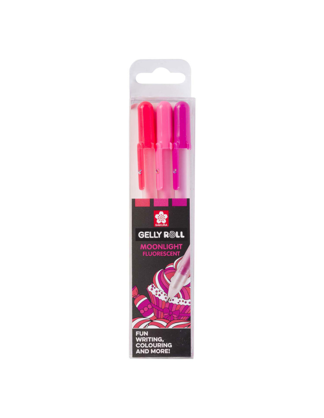Een set van 3 van de zoetste kleuren roze Moonlight gelpennen voor een uniek, eigen kleurig fluorescerend effect in Fluorescerend Vermiljoen (418), Fluorescerend Roze (420) en Rozenrood (421).