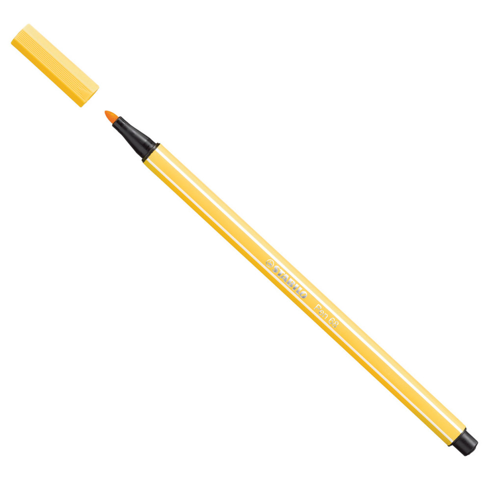 STABILO Viltstift - Geel (68/44). Deze pen is uiterst geschikt voor lijnen mee te trekken of grote oppervlakken mee in te kleuren. Bent u de dop na het tekenen vergeten om de dop erop te doen? Geen probleem, de pen kan maar liefst 24 uur zonder en droogt daarom niet uit. Drukt u regelmatig wel eens te hard op de punt? Geen probleem, deze pen is zelfs drukbestendig. De schrijfbreedte is ongeveer 1mm en de pen is voorzien van een ronde punt.